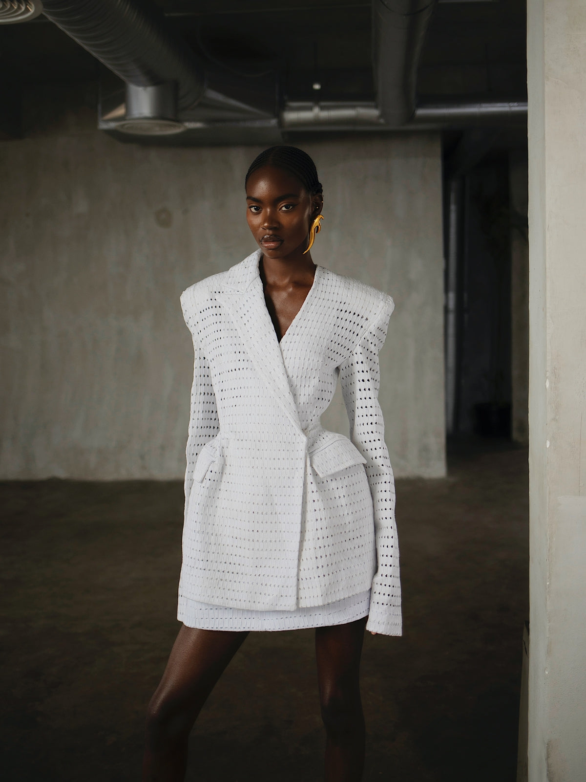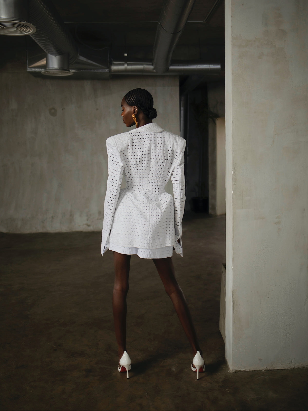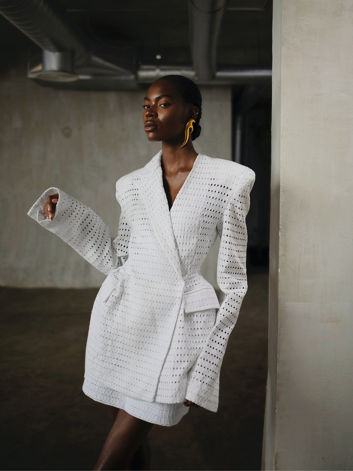 Nigerian label Fruché breathe new life into the timeless skirt suit with this statement-making set, crafted from handwoven Aso-Oke cotton in crisp white. The strong-shouldered blazer nips dramatically at the waist, creating a striking silhouette, while the matching mini skirt ensures a leg-lengthening effect. Perfect for a rehearsal dinner or bridal shower—just add bejeweled slingbacks and a clutch.