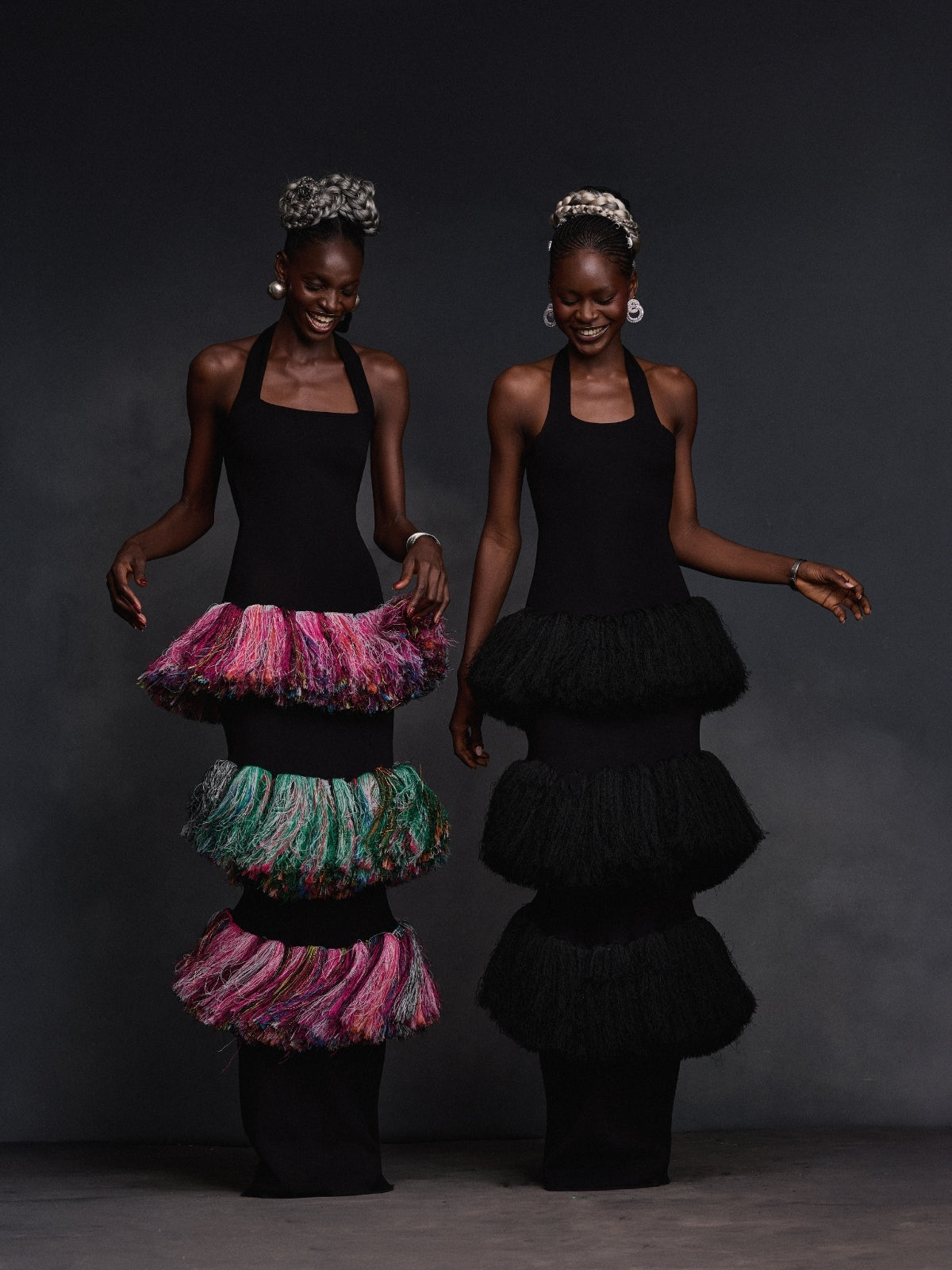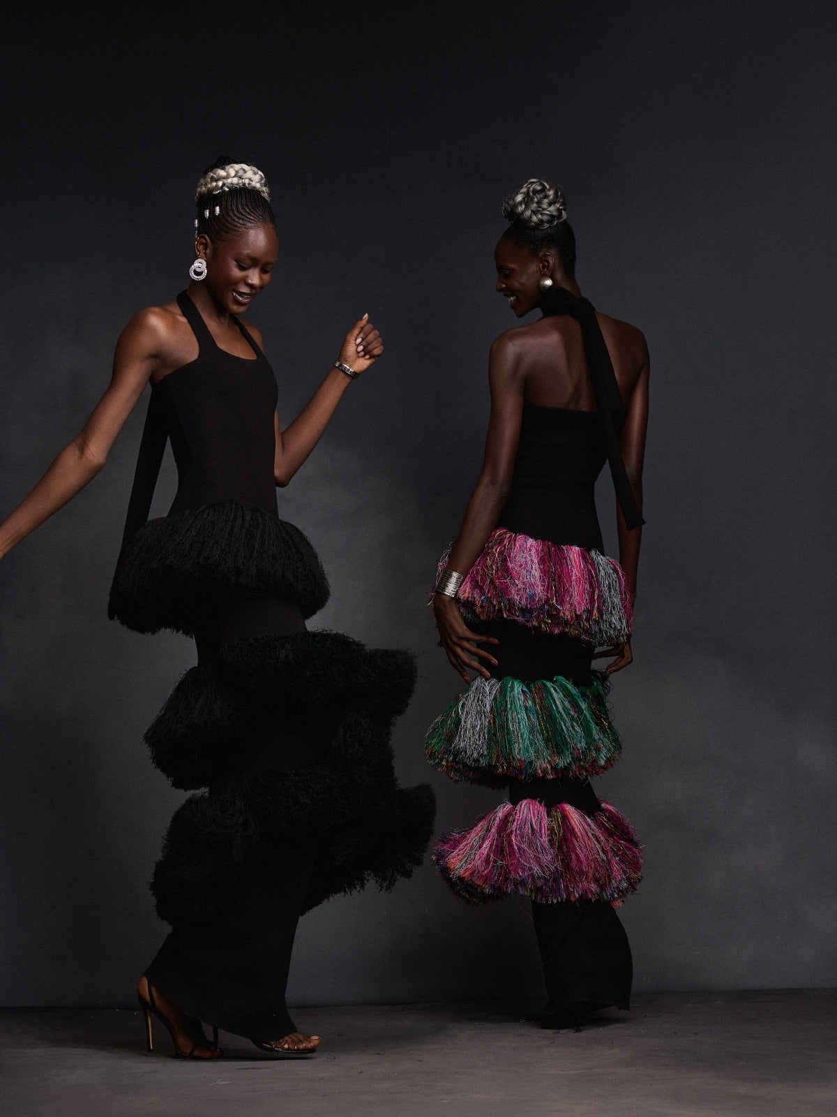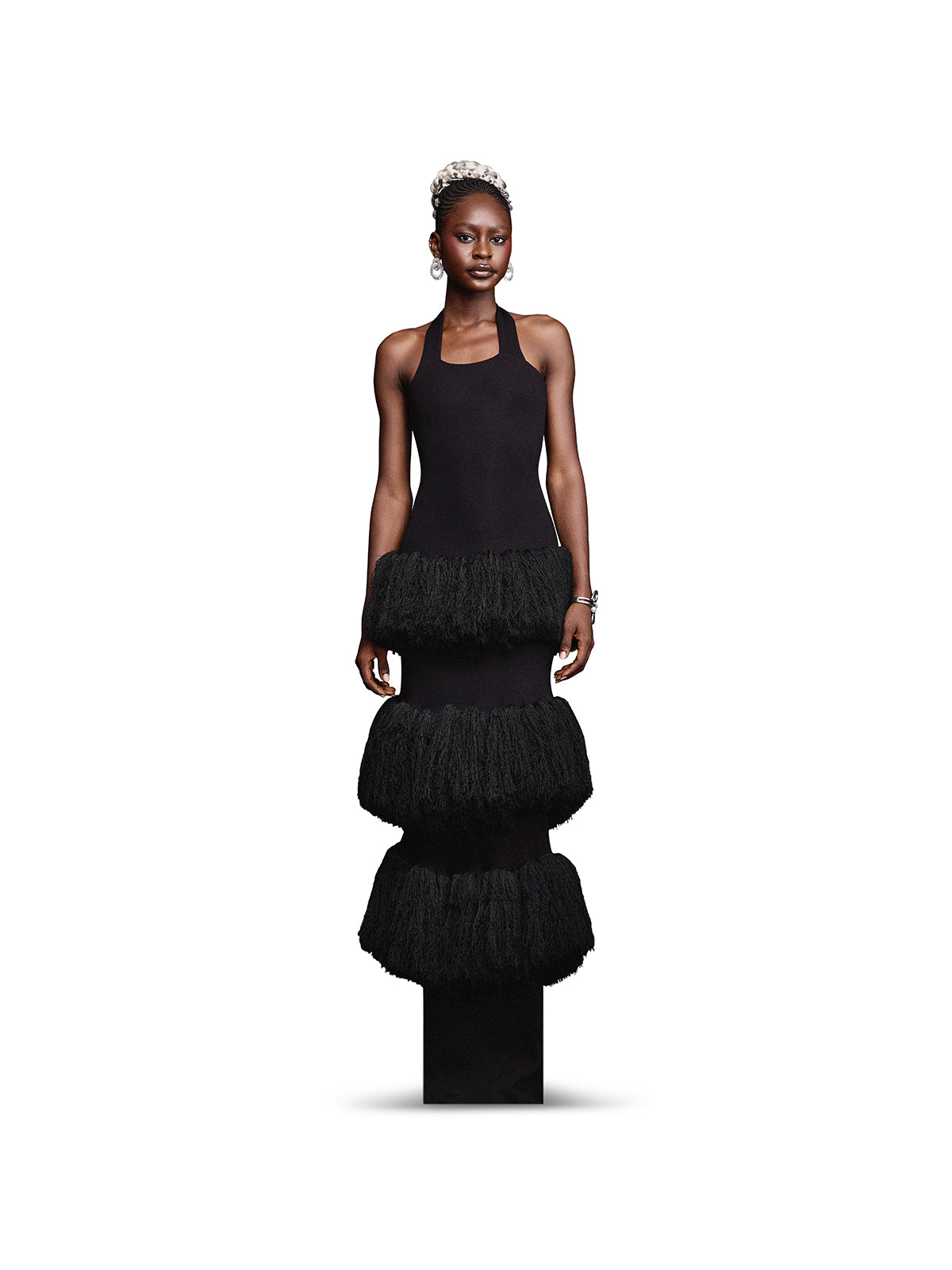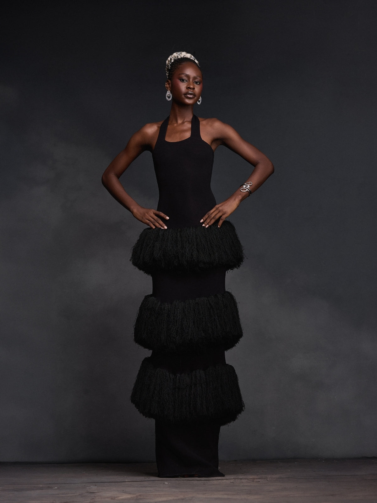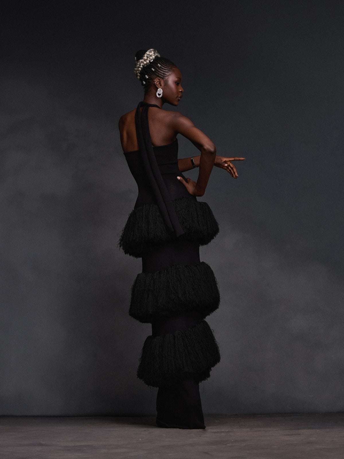 Sleek and sensual, the Dika Dress captivates with layered hand-threaded fringe that moves with the body. Its halter neckline and fitted silhouette highlight craftsmanship through subtle texture and tactile rhythm. Elevate with strappy heels and a slicked-back bun to emphasize its fluid detailing.