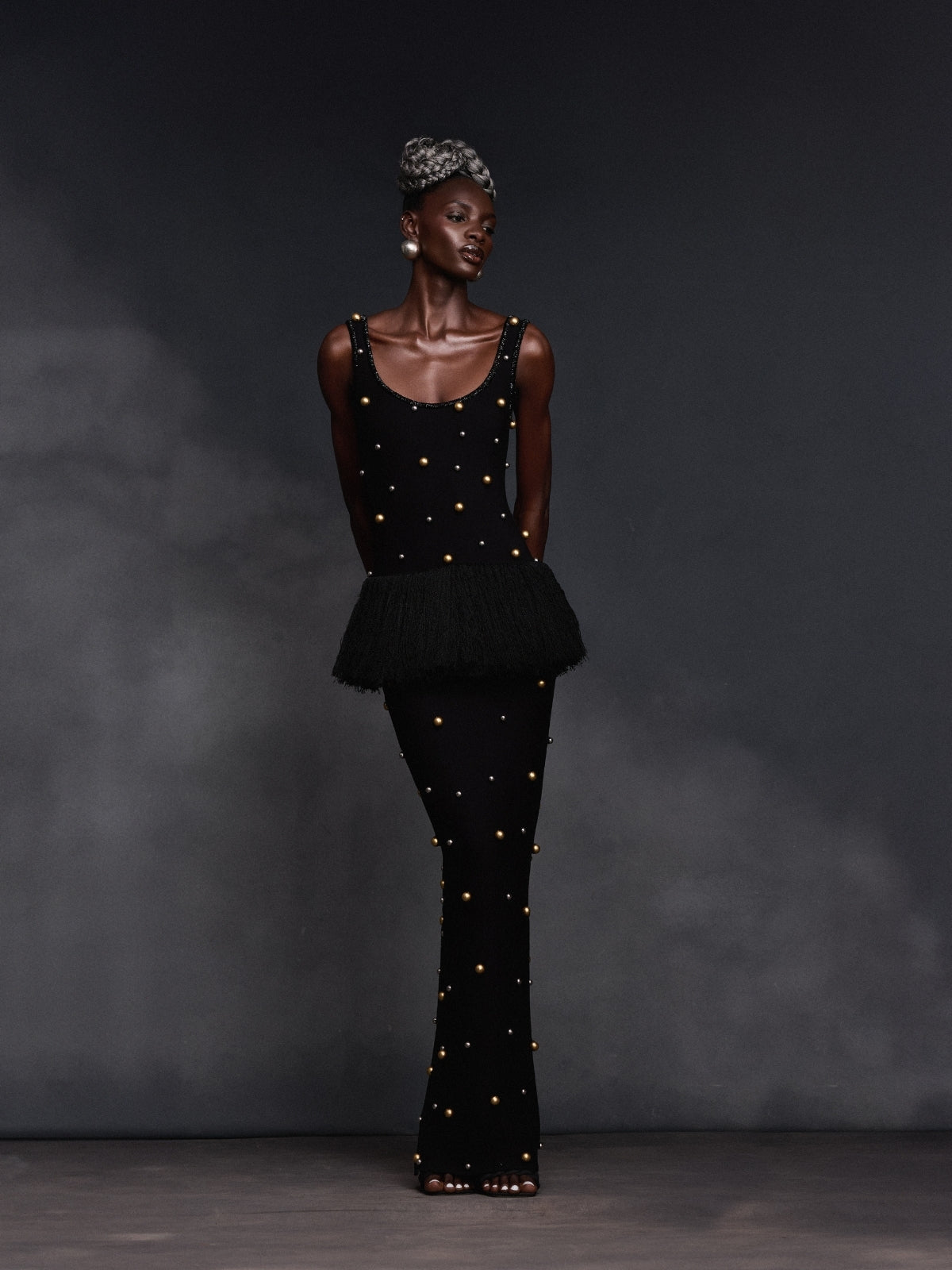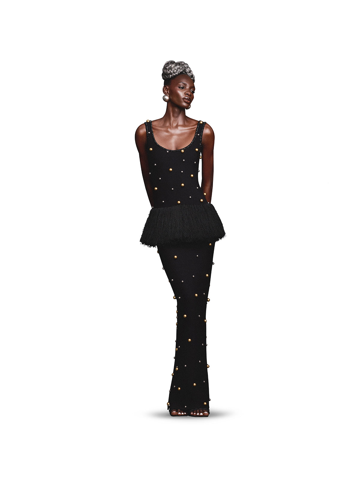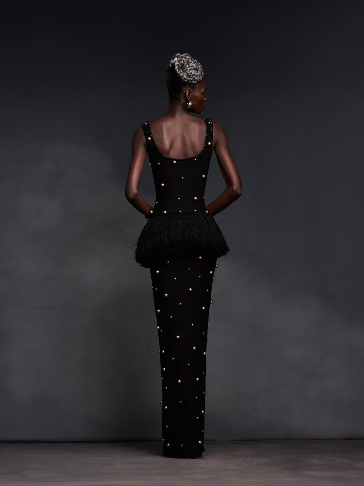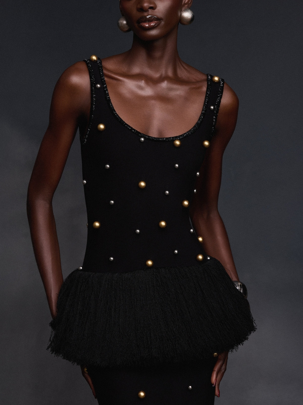 The Dosi Dress blends ease and allure with its tank-style cut and hand-threaded rayon fringe that sways with every step. Its sleek black hue and meticulous craftsmanship make it both understated and captivating — a celebration of motion and artistry. Style with statement earrings and strappy heels for a sleek evening look.