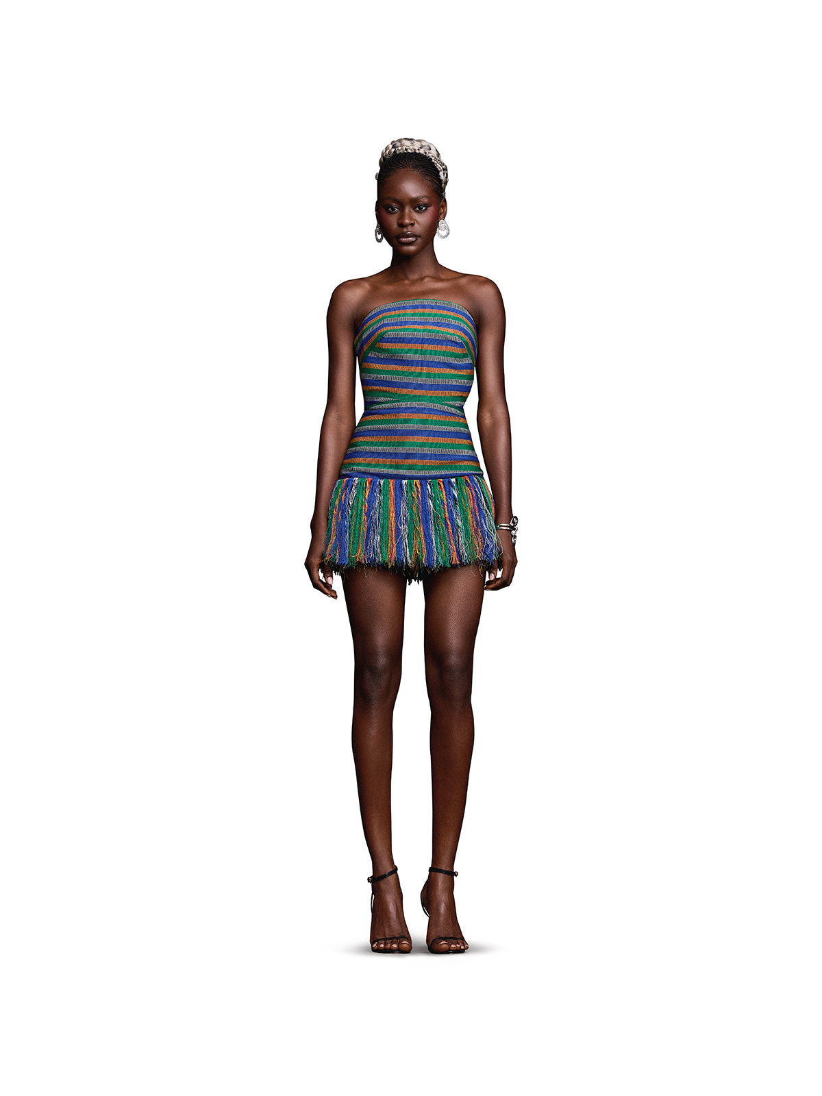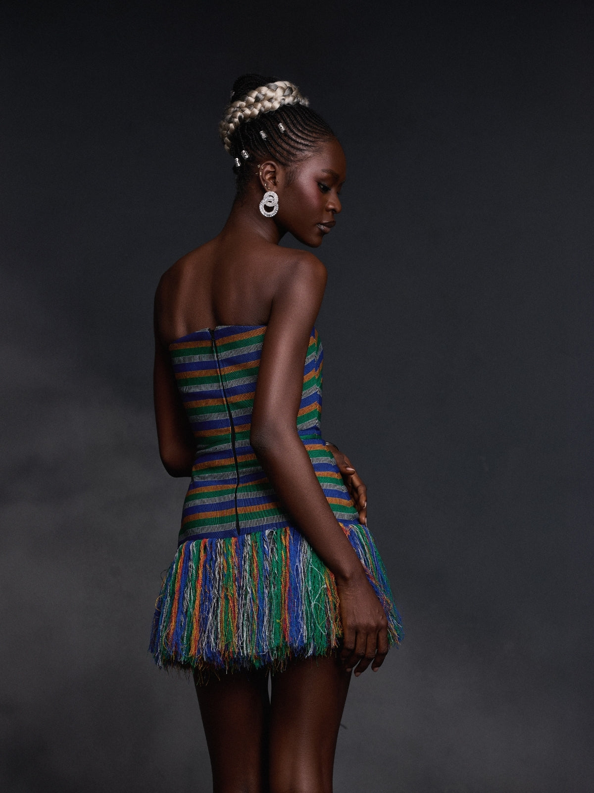 With its structured form and vibrant woven stripes, the Mara Dress captures both energy and elegance. Cascading fringe at the hem creates playful movement, while the strapless cut adds a confident, modern edge. Complement its color play with bold heels or layer with a light shawl for an elevated evening look.