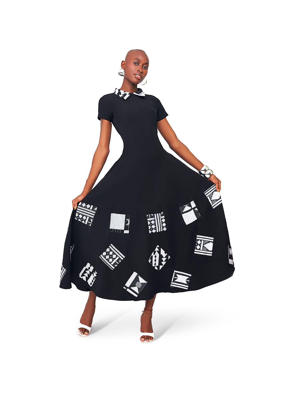 - Round neck, pointed collar, short sleeves, fitted waist, flared skirt, mid-calf length