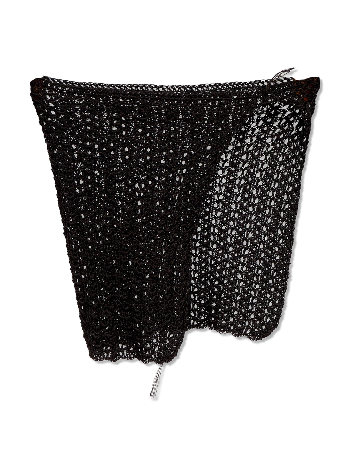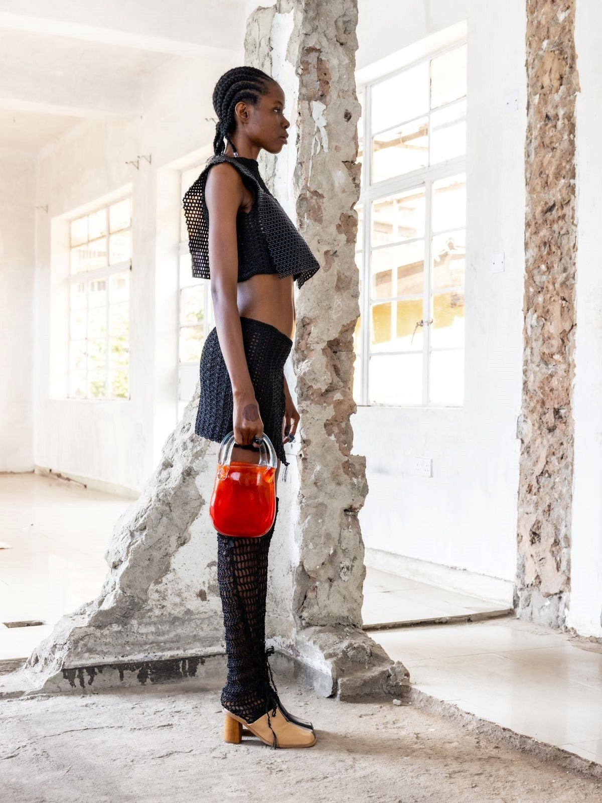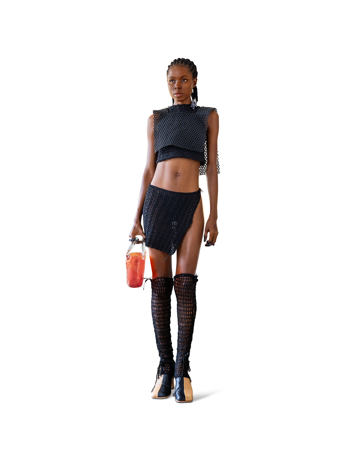 Balancing craft with edge, IAMISIGO’s mini skirt is handmade in Nigeria from recycled fishing twine, using traditional craftsmanship techniques. The open-weave texture, 90s-inspired low waist, and daring side slit create a bold interplay of sensuality and structure, showcasing the brand’s eclectic vision. Pair it with the matching Crochet Top or layer under an oversized button-down for a more laid-back look.
