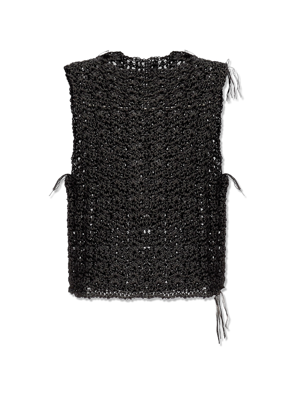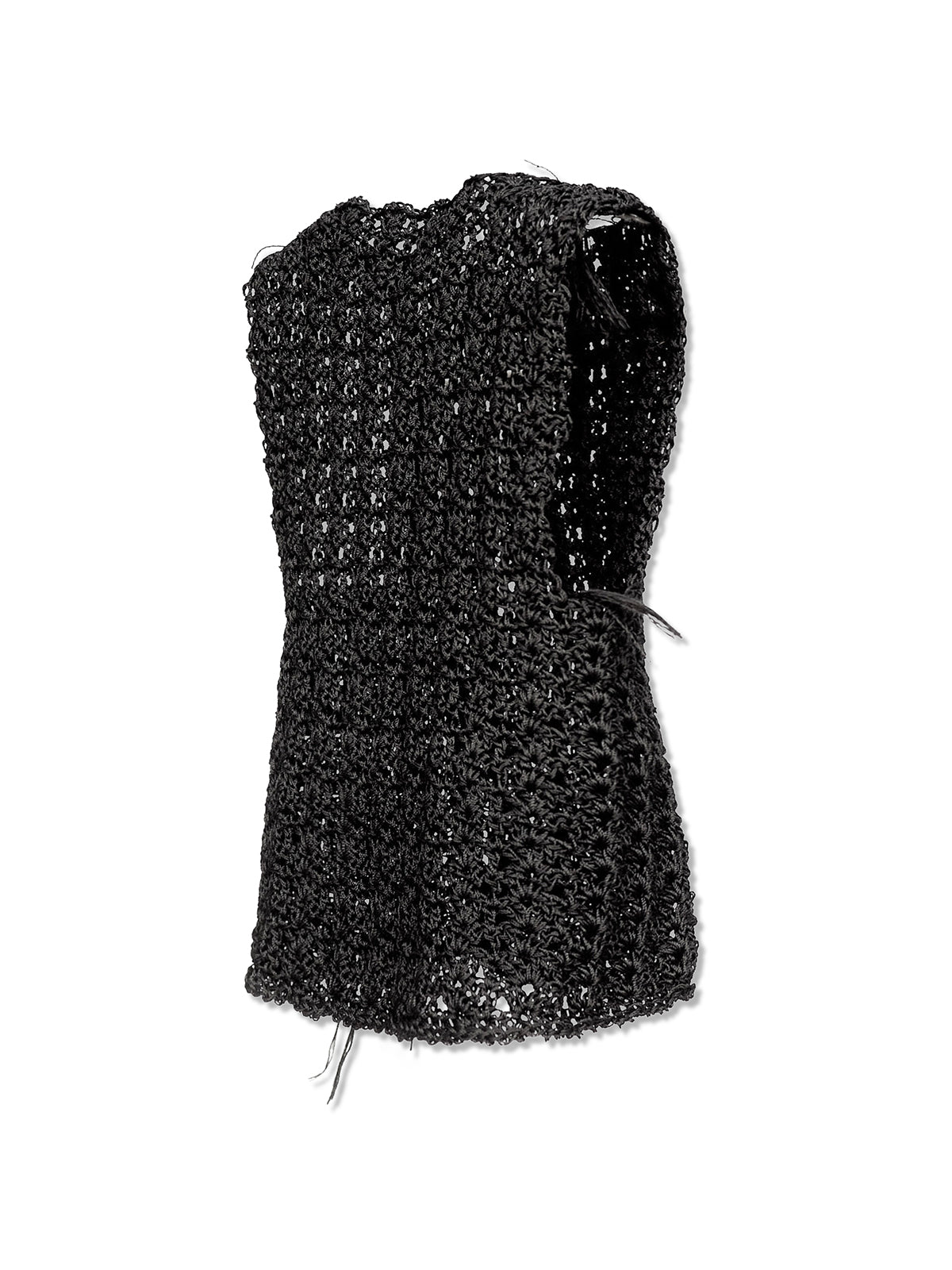 Showcasing a traditional crochet technique updated through a conscious lens, IAMISIGO’s top transforms recycled fishing twine into a striking open-weave silhouette. The layered design conceals and reveals in a subtle interplay, while the cropped cut lends it a dynamic edge. Don’t miss the matching Crochet Skirt for a head-turning ensemble, or style it with high-waisted pants for a balanced, textural contrast.