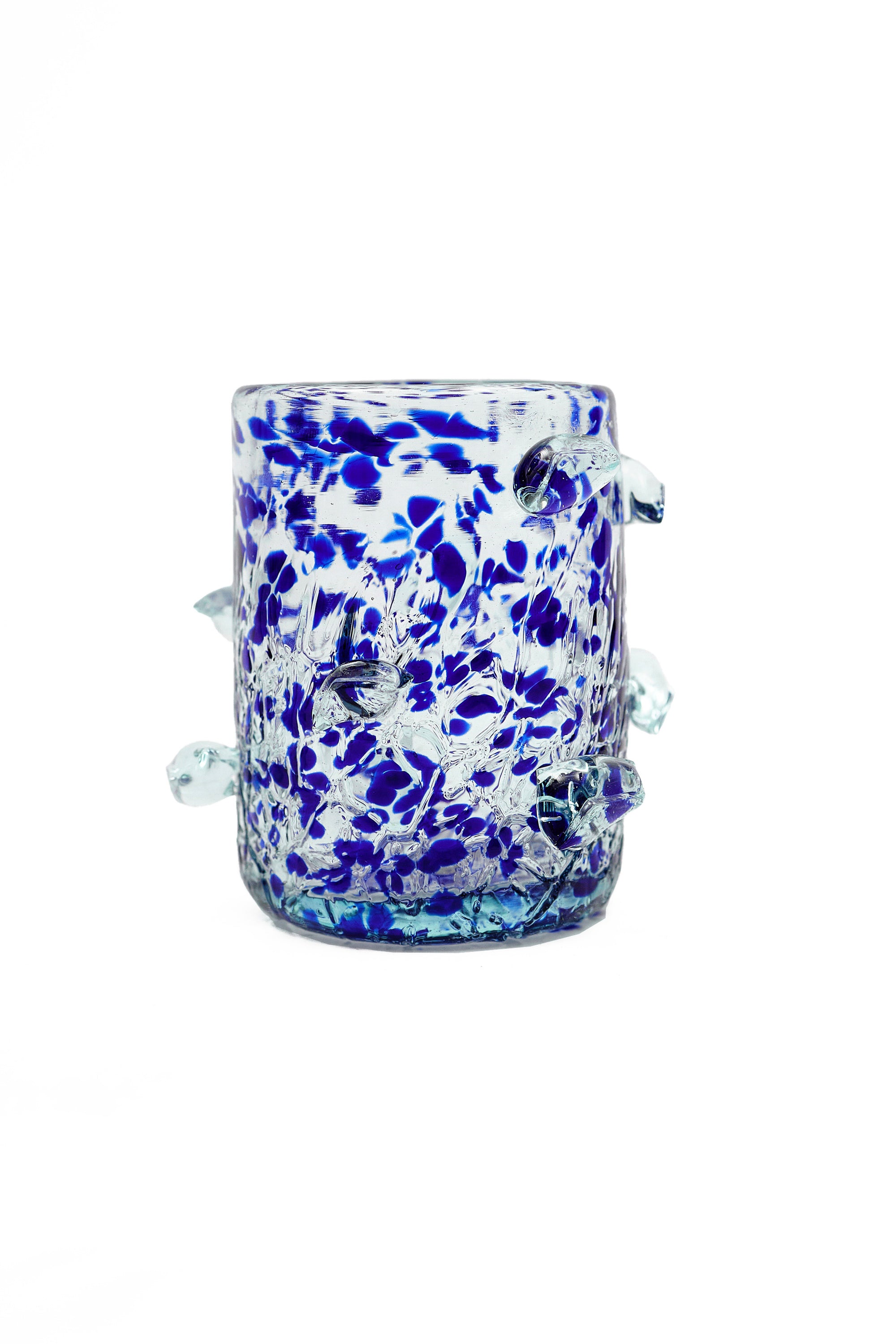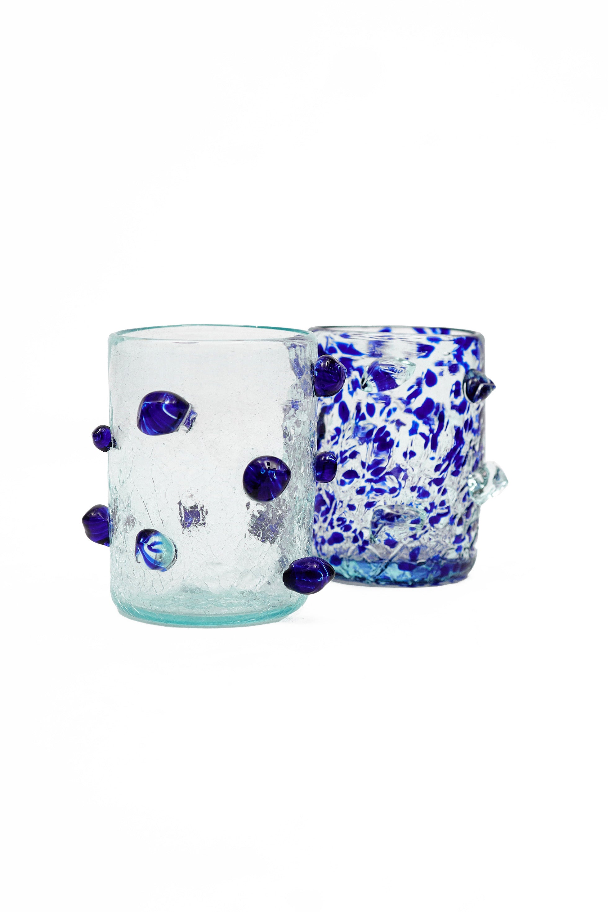 A joyful study in contrast and craftsmanship, the Dotted Cups set transforms everyday glassware into art. Each hand-blown tumbler celebrates individuality: one clear vessel adorned with sculptural cobalt blue dots, the other awash in a confetti-like dance of blue and clear glass. Together, they embody IAMISIGO’s ethos of embracing imperfection as beauty. Playful yet refined, these tumblers elevate the ritual of drinking into an experience of artful expression.