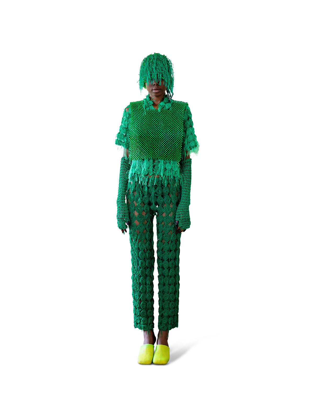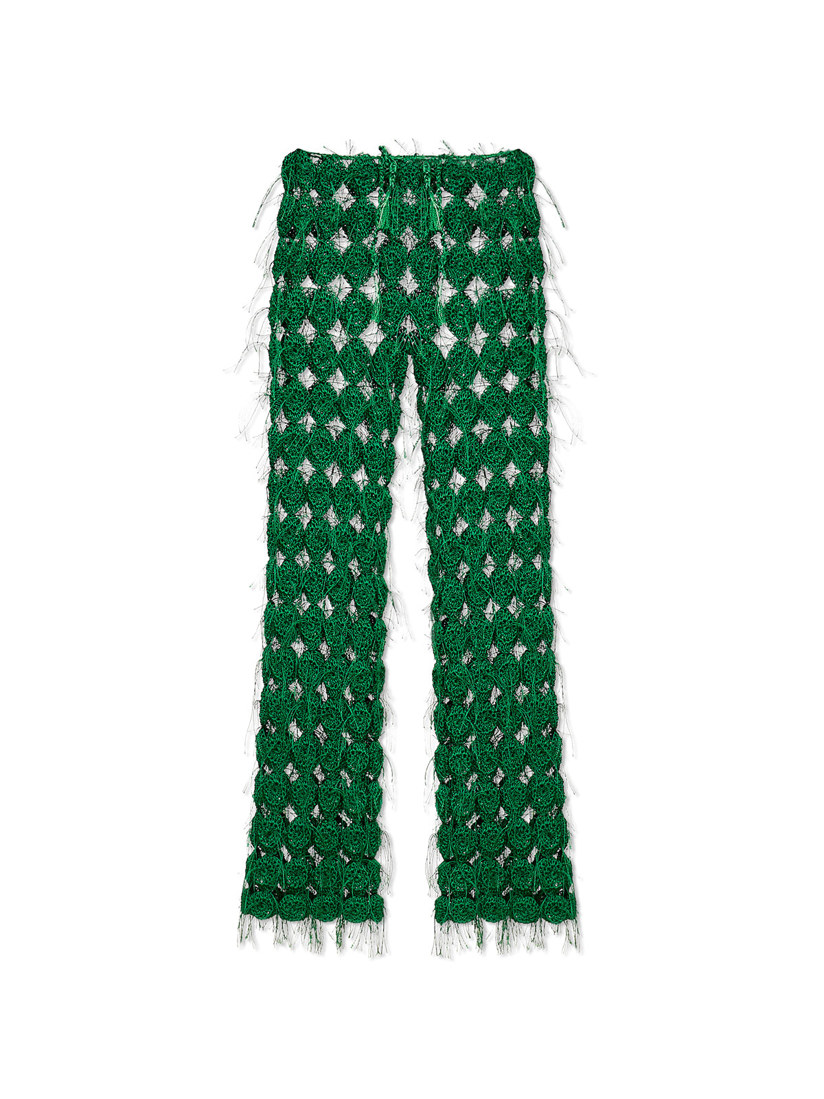 The season’s fashion trophy piece: IAMISIGO’s Crochet Fringed Pants are handmade in Nigeria from recycled fishing twine using traditional techniques. Striking the perfect balance between craft and attitude, they feature a classic straight-leg cut—enlivened with cheeky transparencies and fringe detailing. Dress them down with a simple tank or choose the matching Crochet Fringed Jacket for a bold statement.