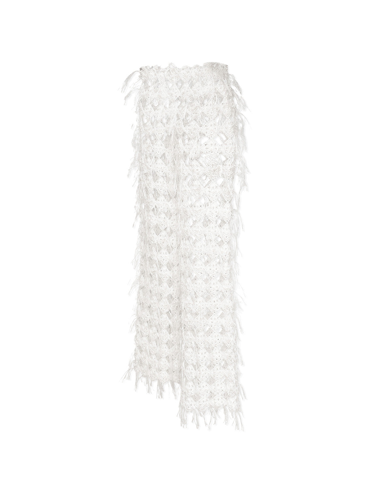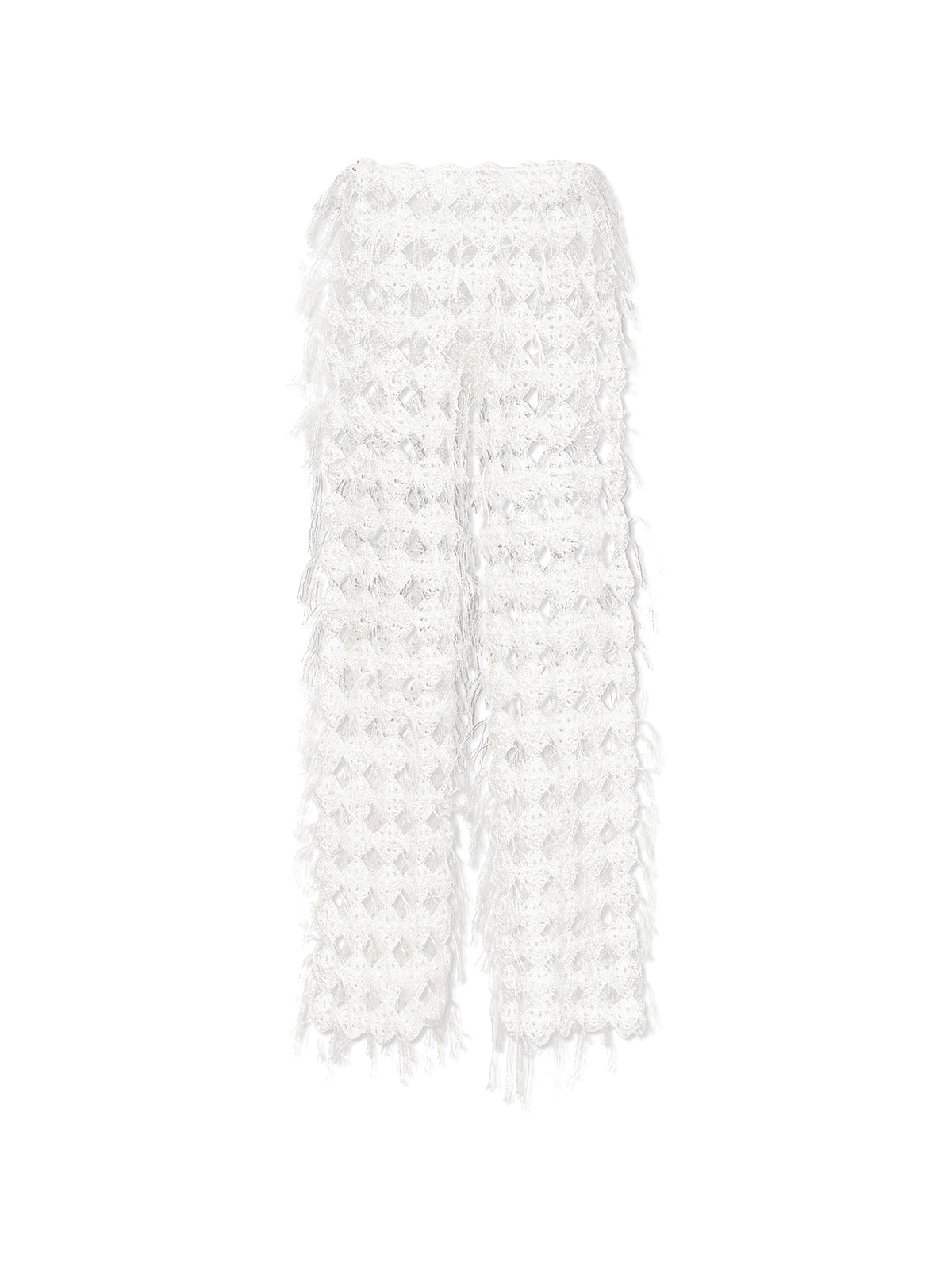 The season’s fashion trophy piece: IAMISIGO’s Crochet Fringed Pants are handmade in Nigeria from recycled fishing twine using traditional techniques. Striking the perfect balance between craft and attitude, they feature a classic straight-leg cut—enlivened with cheeky transparencies and fringe detailing. Dress them down with a simple tank or choose the matching Crochet Long-Sleeve Top for a bold statement.