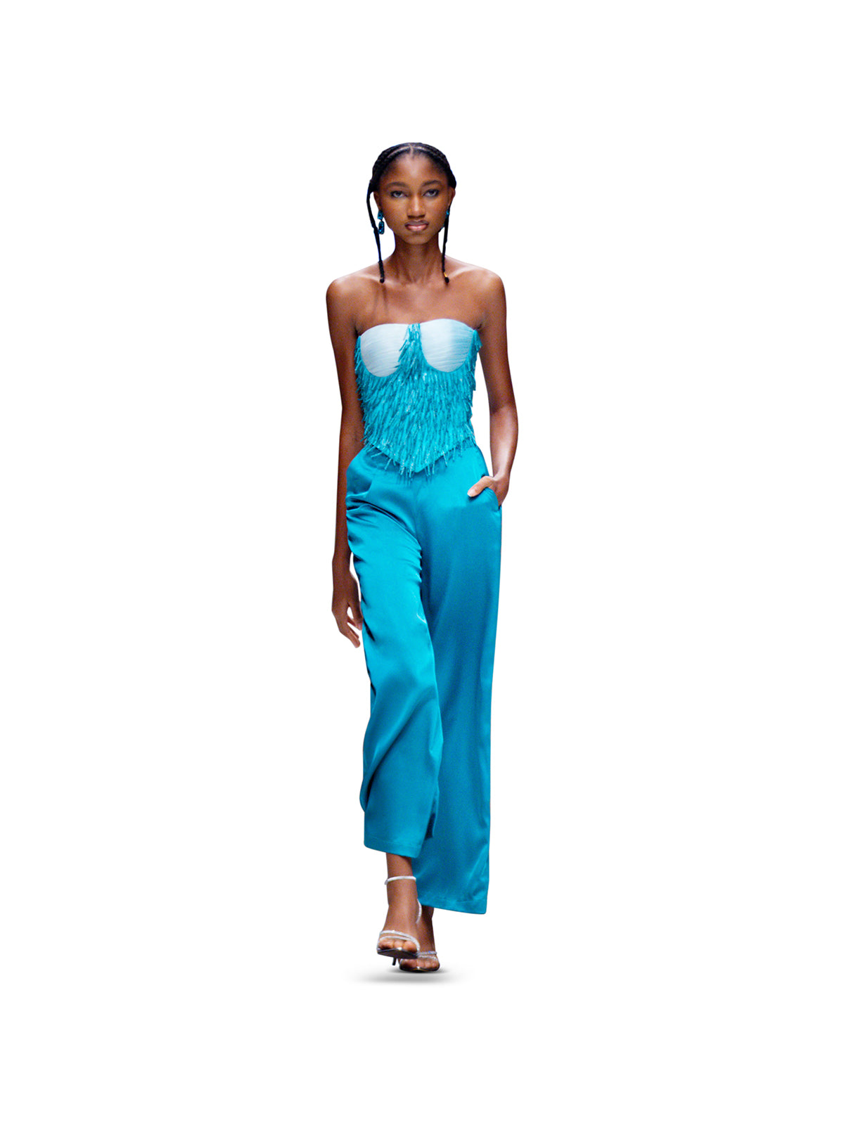 Rich textures and unexpected pairings redefine statement dressing in Ibilola Ogundipe's Mai Set. The striking strapless top is crafted from the brand's signature liquid organza with fringe detailing and artisanal beadwork adding plenty of glamour. Meanwhile, the matching silk pants are tailored with single pleats, echoing traditional masculine styles. Wear yours with crystal-embellished sandals, as spotted on the runway.