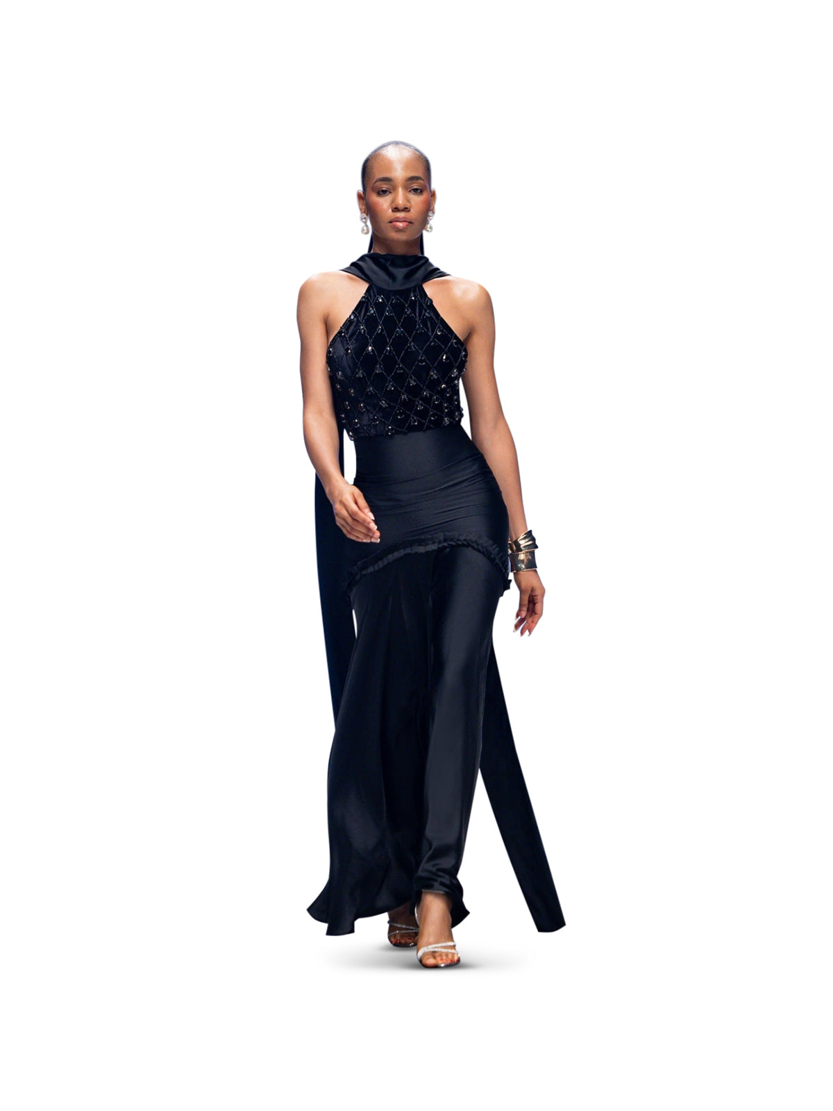 Elegant and architectural, the Kaly Dress in black distills Jewel Jemila’s design language into a timeless statement. The structured bodice features a high neckline with scarf detailing and a quilted, bead-embroidered pattern that adds refined texture. The waistline is precisely tailored to accentuate the form before cascading into a dramatic flared skirt with a subtle ruffle accent. Both bold and graceful, it moves effortlessly from formal occasions to evening. Style with crystal earrings and an elegant clutch for refined evening sophistication.