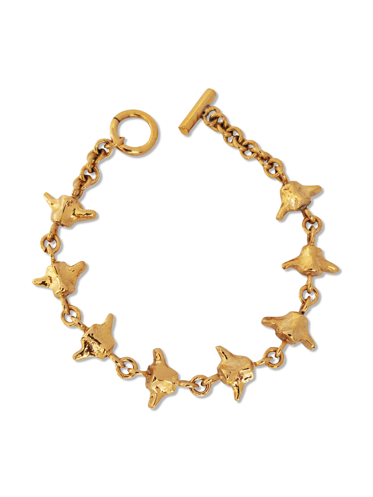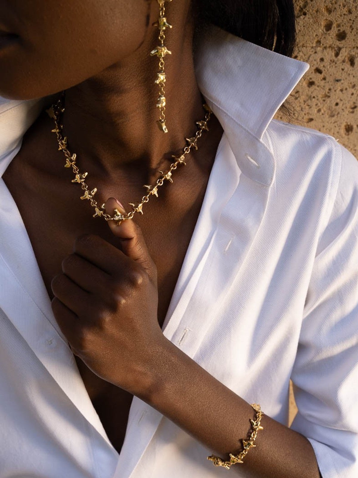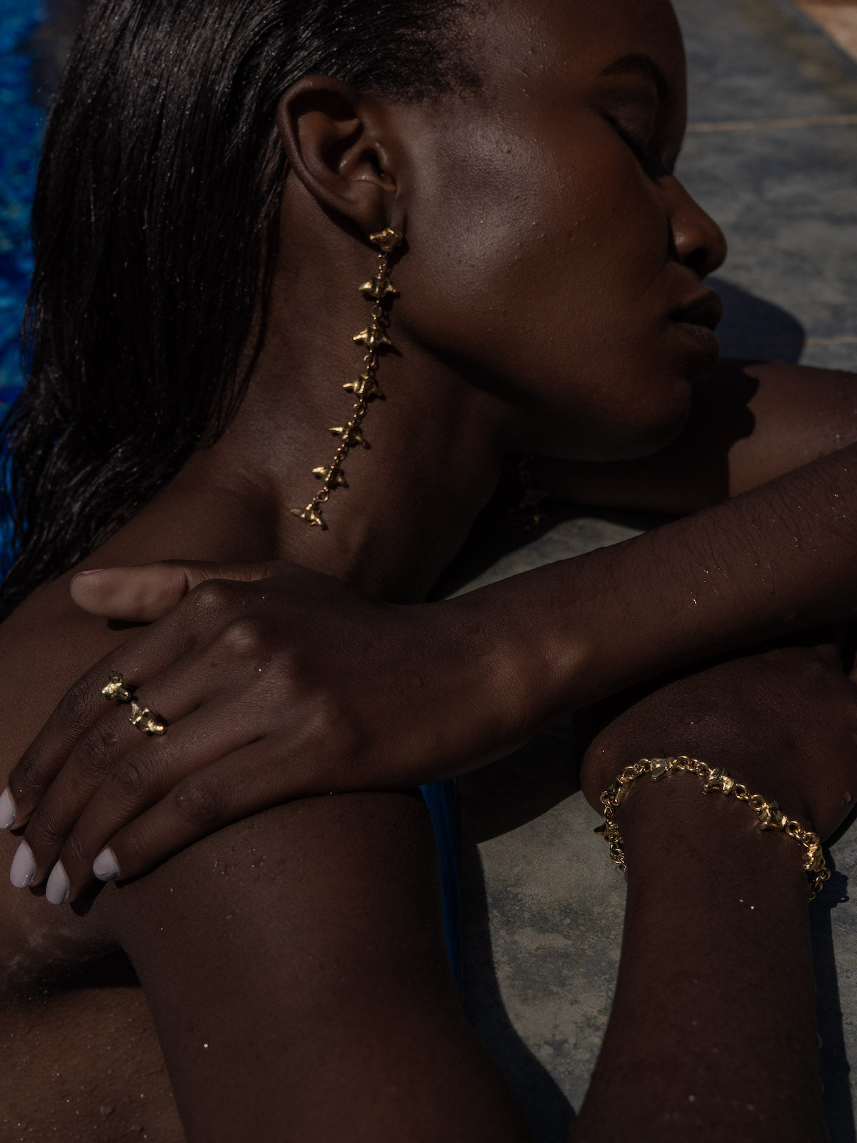 Jiamini’s talismanic jewels are influenced by the mystic symbols drawn from Kenyan heritage. The gold-plated brass rings of this bracelet are designed to resemble a spinal cord—a recurring theme in the latest collections. Each piece is handcrafted by the brand’s team of female artisans using reclaimed materials. Wear yours stacked with delicate gold bangles.