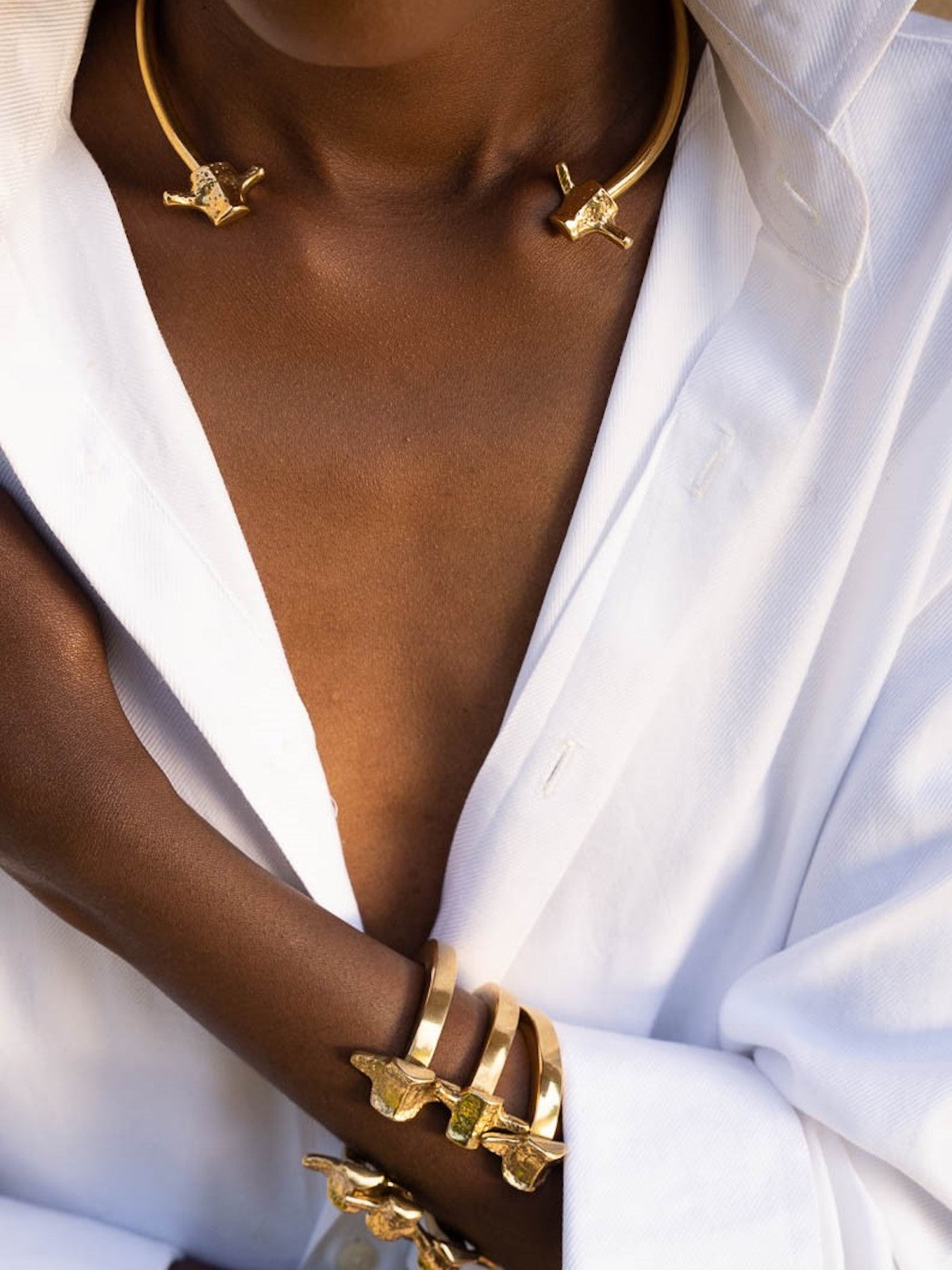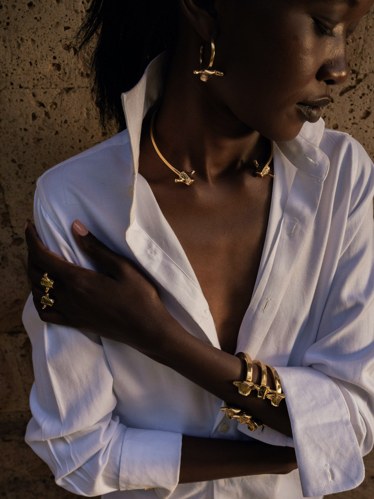A powerful synergy of craftsmanship and storytelling, Jiamini’s jewelry pieces are a timeless investment. This sculptural bracelet is part of the brand’s Mung’ung’uti collection—meaning ‘spine’ in Swahili. Meticulously handmade from gold-plated brass by a team of skilled artisans, it will add a modern twist to the simplest looks.