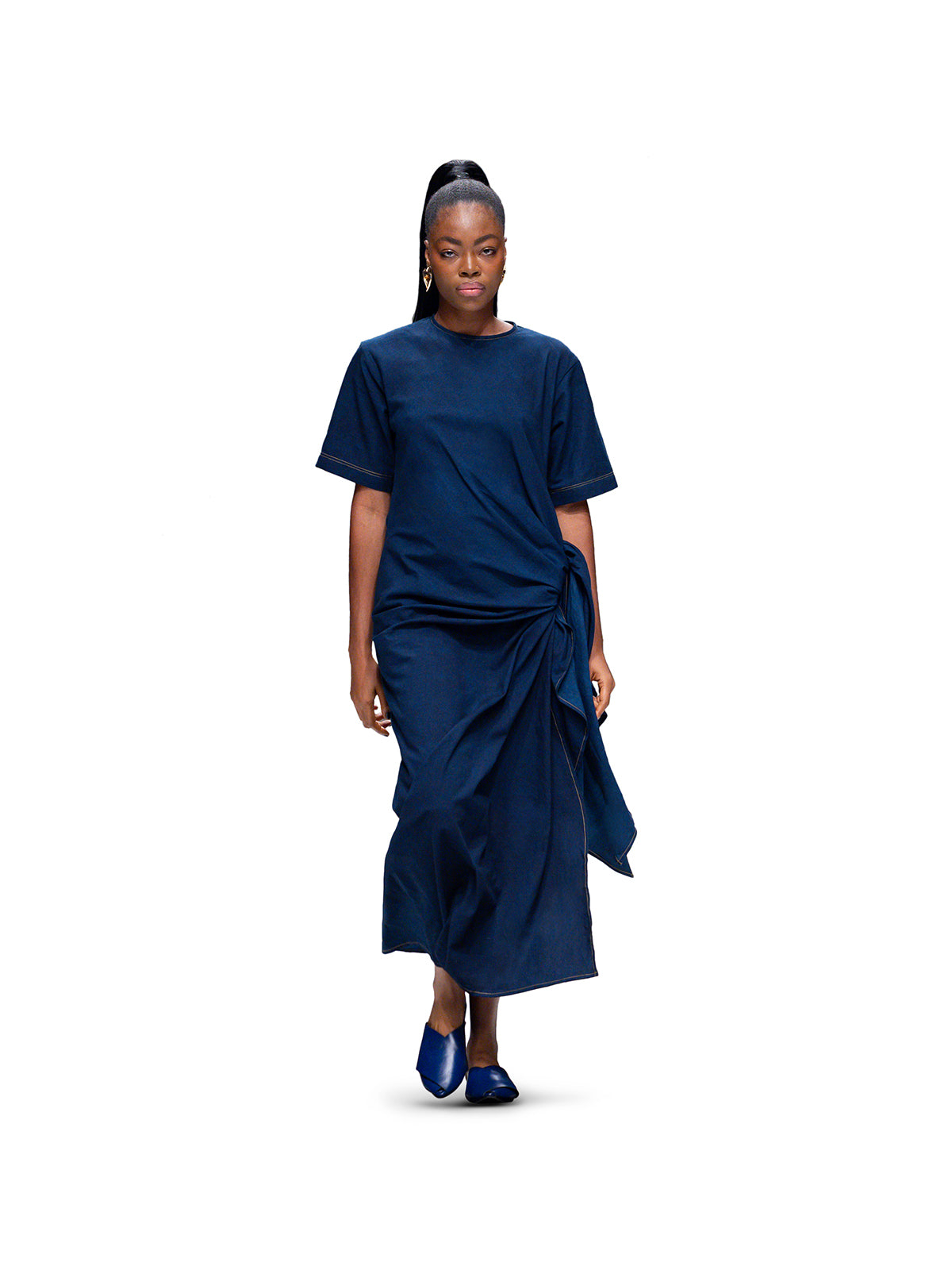 JZO's Altine Dress celebrates heritage through a modern lens. It's made by local artisans from Funtua cotton—grown and woven in Northern Nigeria—and hand-finished at the age-old Kano dye pits, preserving centuries-old techniques. The artfully knotted detail at the waist accentuates your curves, adding a touch of elegance to the loose, deconstructed shape. Style yours with tonal mules and a high ponytail, as seen on the runway.