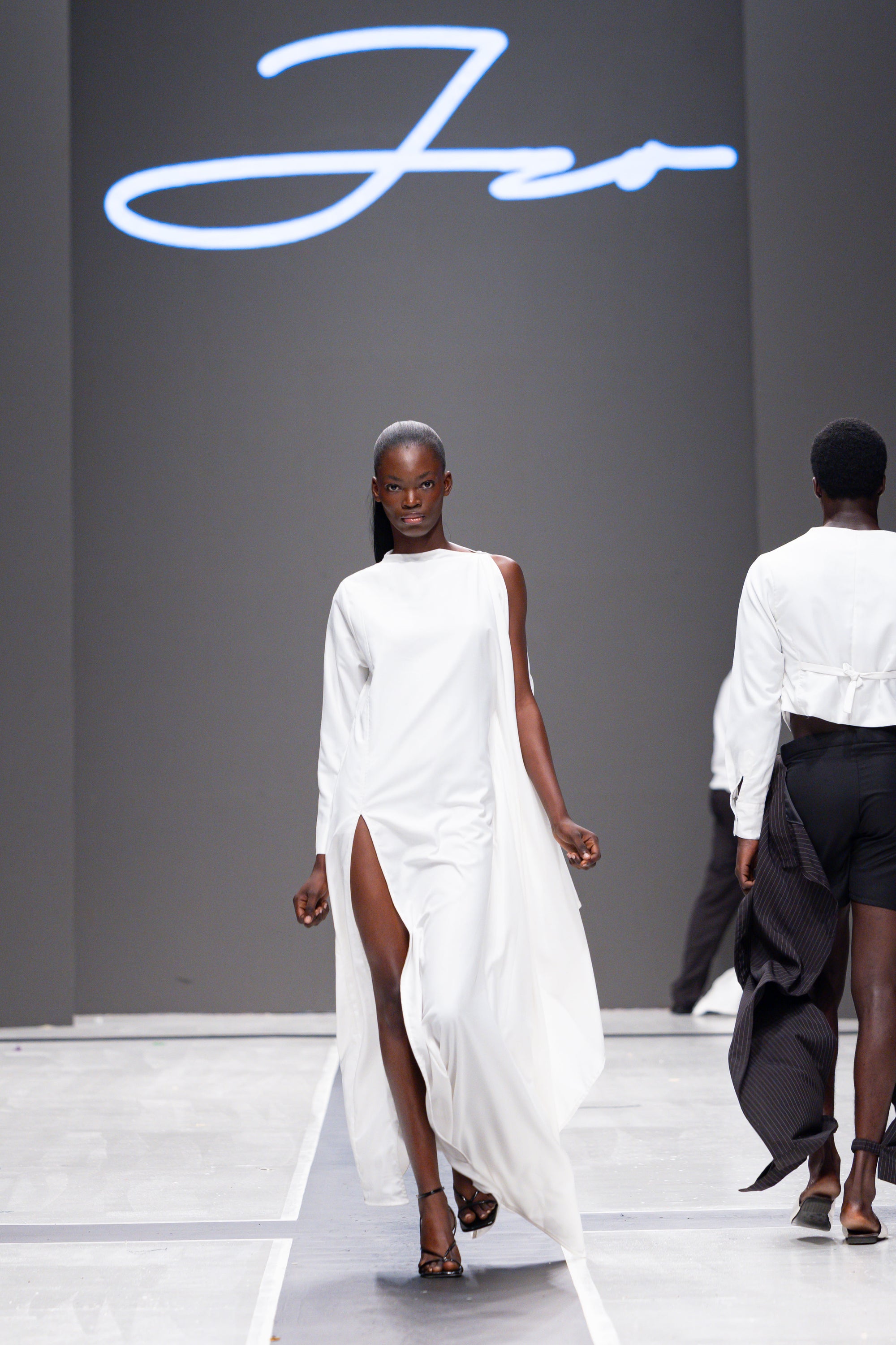 JZO's Asibi Dress exudes timeless elegance with its dramatic one-sleeve design and fluid maxi hem. Crafted in Kaduna, Nigeria, from pristine white cotton in a slightly loose fit, it's spliced at the thigh to reveal glimpses of skin. Complete the look with a sleek updo and strappy sandals, as seen on the runway.