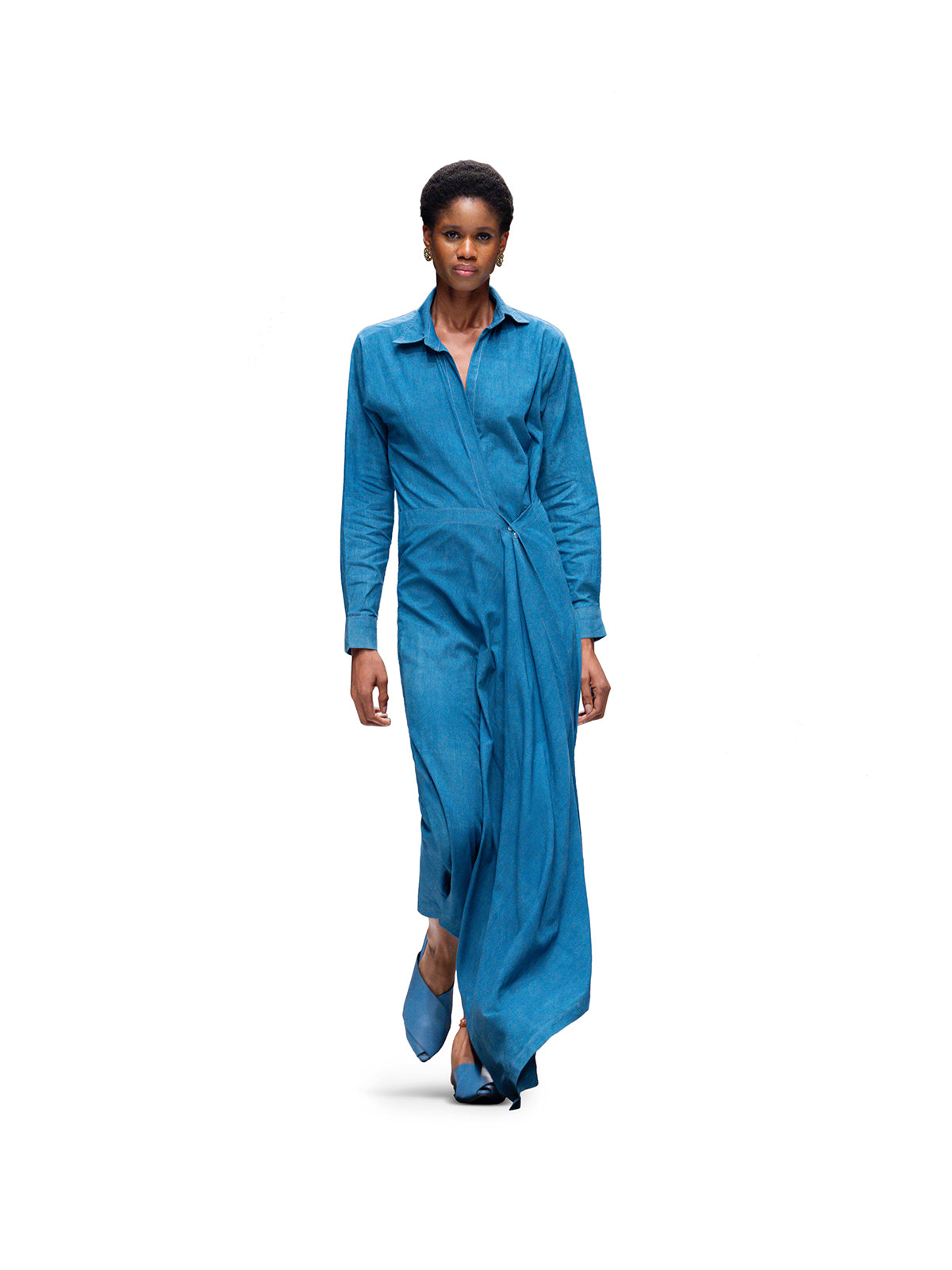 JZO's runway show was filled with relaxed silhouettes and sculptural details reminiscent of menswear, as showcased by this Laraba Dress. It's cut from lightweight Funtua cotton—grown and woven in Northern Nigeria—and tinged with a soft light-blue hue at the ancient Kano dye pits. The knotted front and shirt-inspired detailing beautifully balance ease and elegance. Style yours with knee boots or sandals, depending on the season.