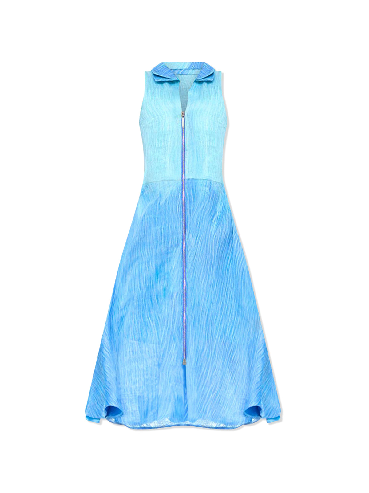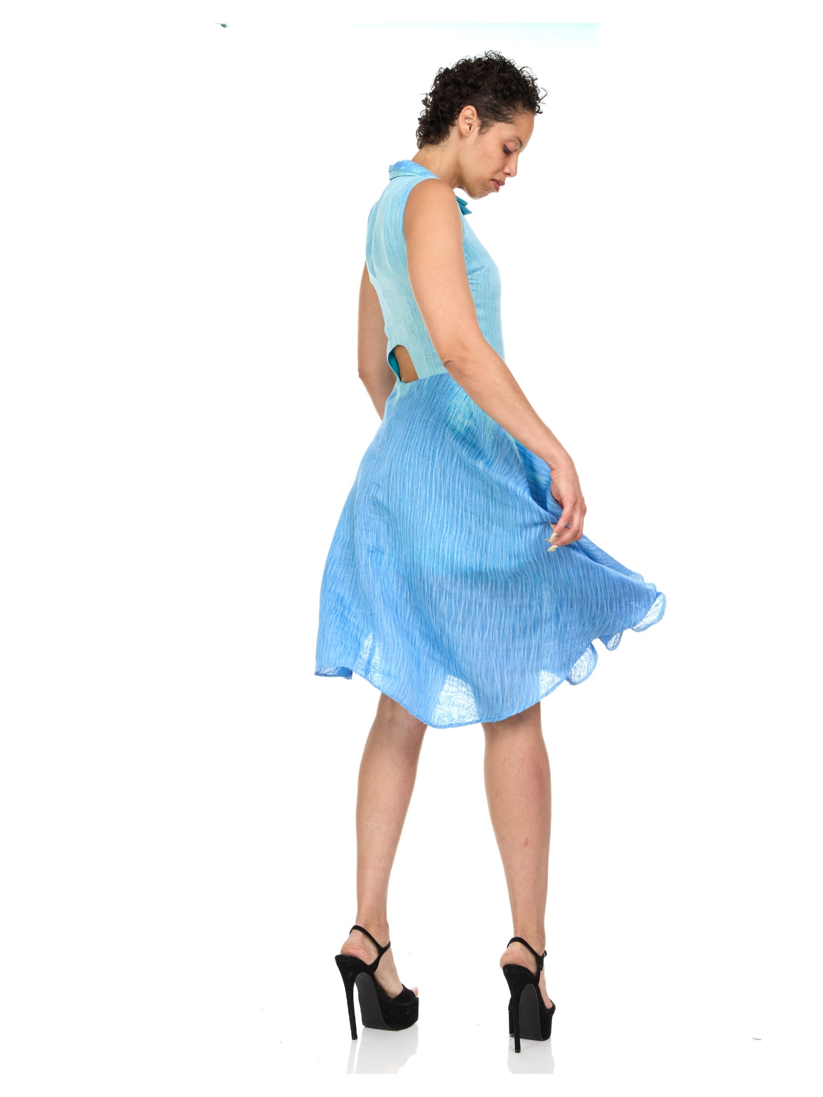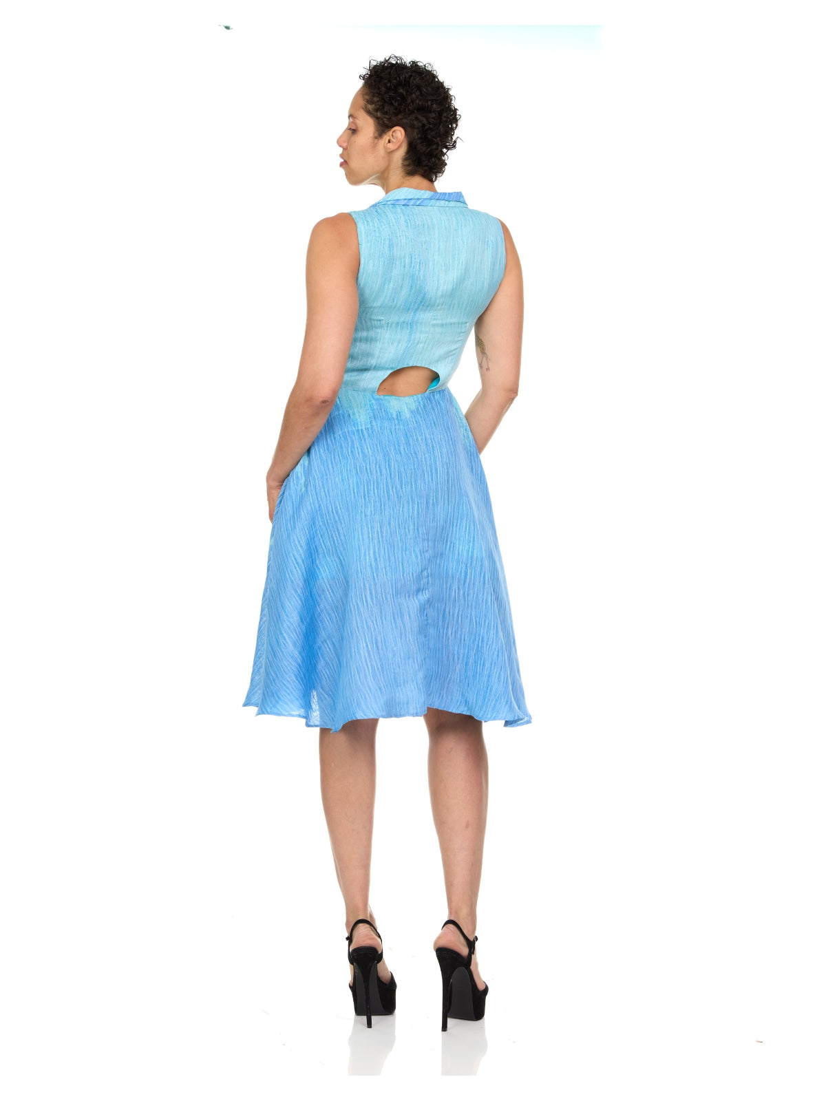 Kahindo’s Double Collar Ombré Dress brings a modern twist to timeless elegance. Featuring a distinctive double-layered collar, this striking silhouette captures the soft, fluid gradient of ocean waves, inspired by the tranquil beauty of the Atlantic. Crafted from luxurious double-layer threaded organza, it’s finished with a cut-out back for a subtle hint of allure and functional details like inseam side pockets and a front zipper. A perfect blend of sophistication and ease, it’s a versatile piece for both daytime and evening moments.