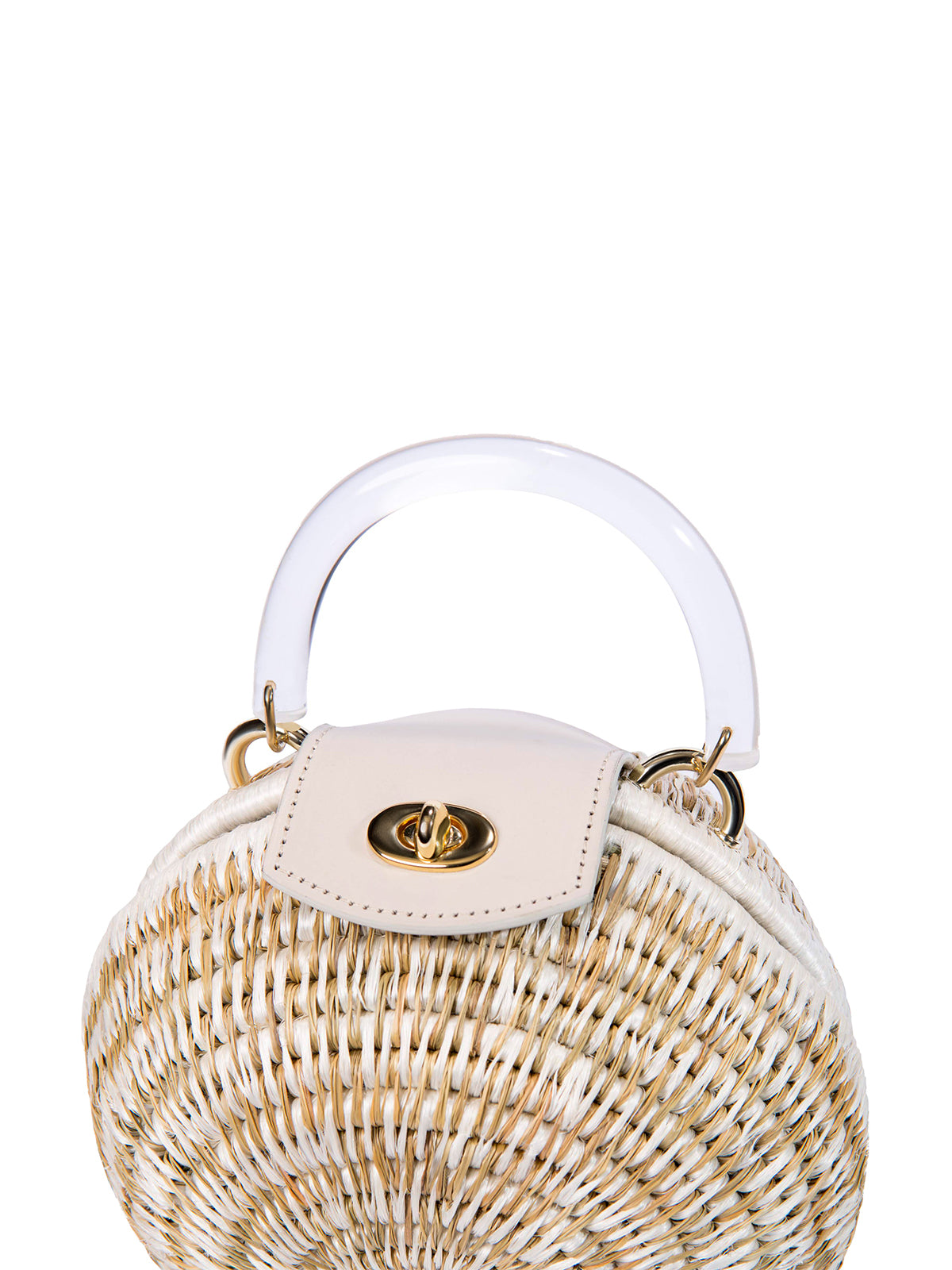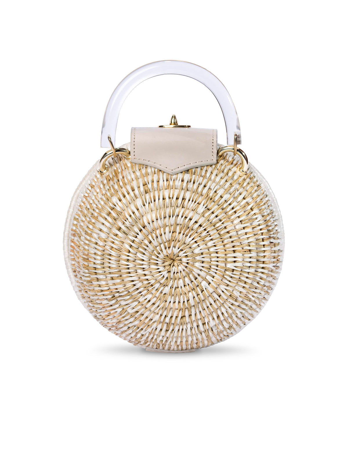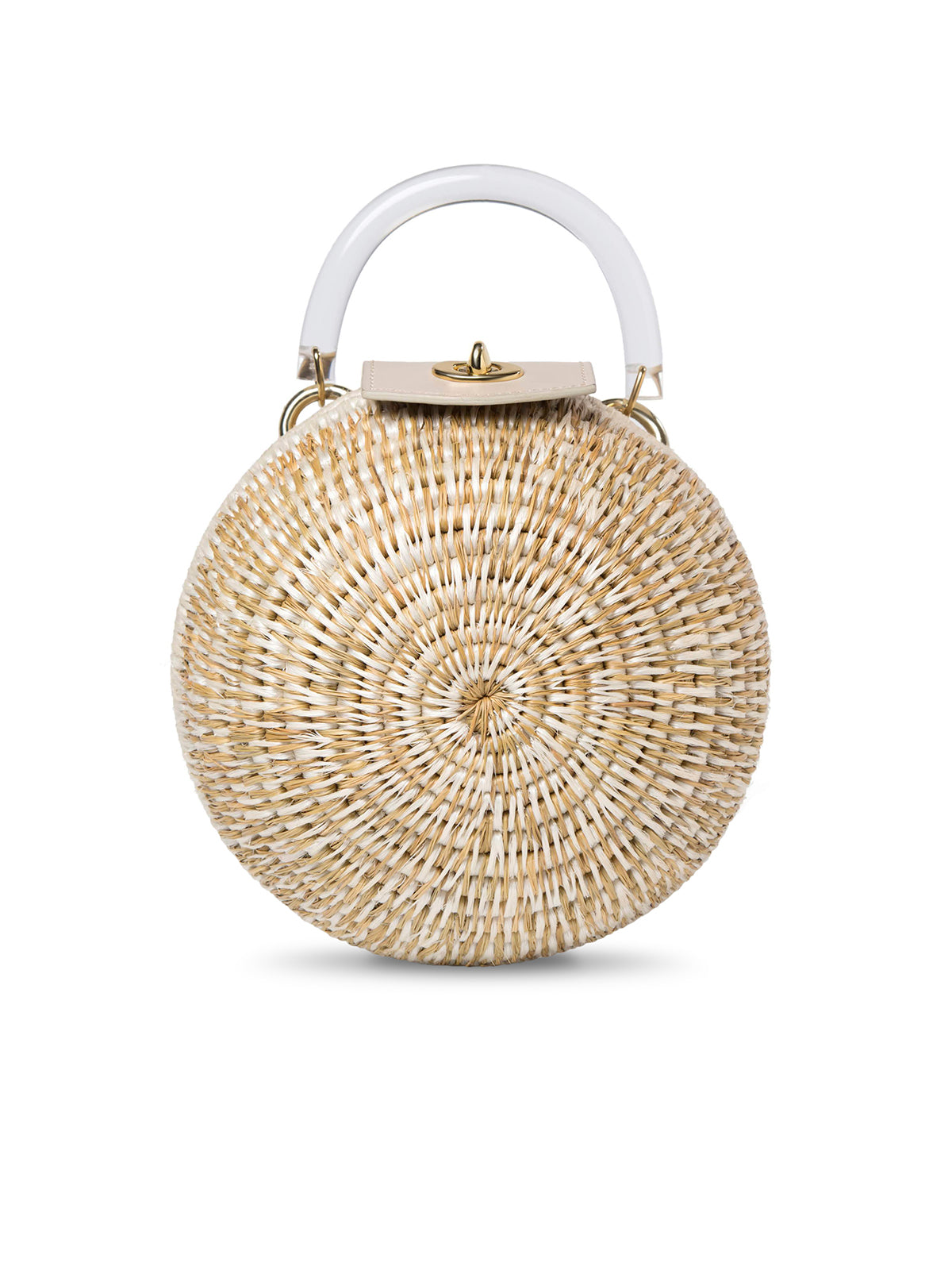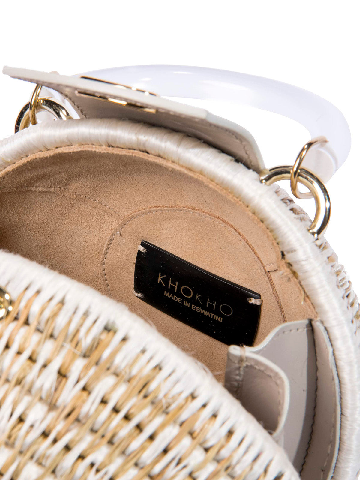 Eswatini landscapes, skyline and indigenous vegetation are the key inspirations for accessories brand Khokho Collection, on display in the Ball Bag's natural fibers. Offered in a chalk tone, each half of this round silhouette is woven into a spiral design and is assembled together with luxurious leather gussets and a gold-tone turnlock closure—adding an element of luxury to the bag's finish.