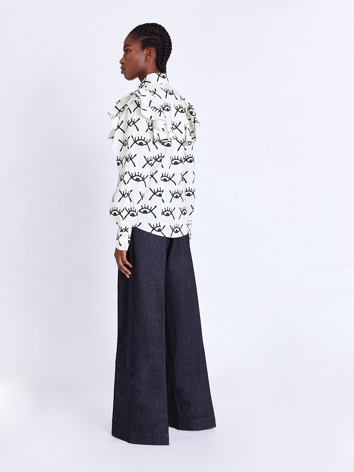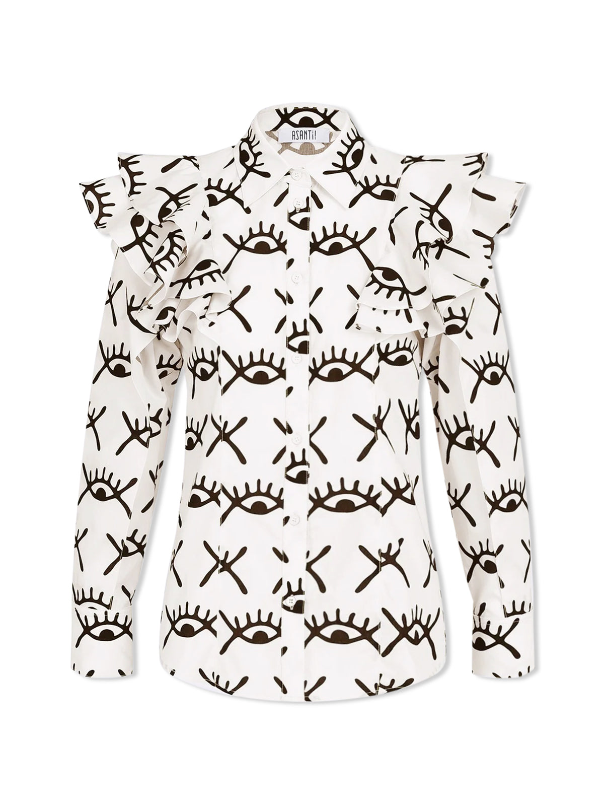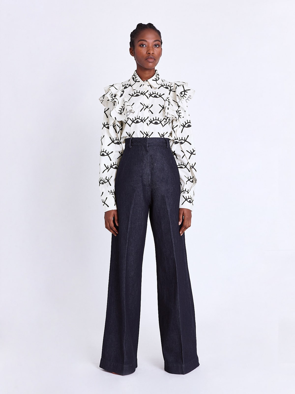 Featuring a bold graphic print and voluminous ruffles cascading down the shoulders and sleeves, Asantii’s Kitoko Shirt will add a playful element to your everyday looks. Crafted from organic cotton sourced from Madagascar and secured with mother-of-pearl buttons, the brand’s focus on provenance ties into its storytelling and signature aesthetic. Case in point: the Abode Santann motif, which is also referred to as the all-seeing eye in Ghanaian symbology. Tuck yours into a pair of tailored pants to keep it in focus. Styled with the Denim Dikamba Wide-Leg Trousers in the photos.