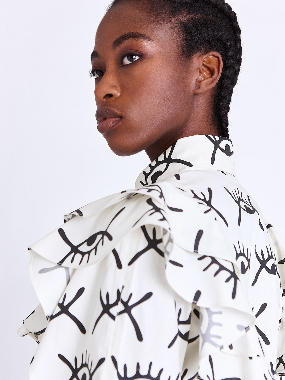 - Pointed collar, long sleeves, fitted cuffs, front button fastening, ruffles