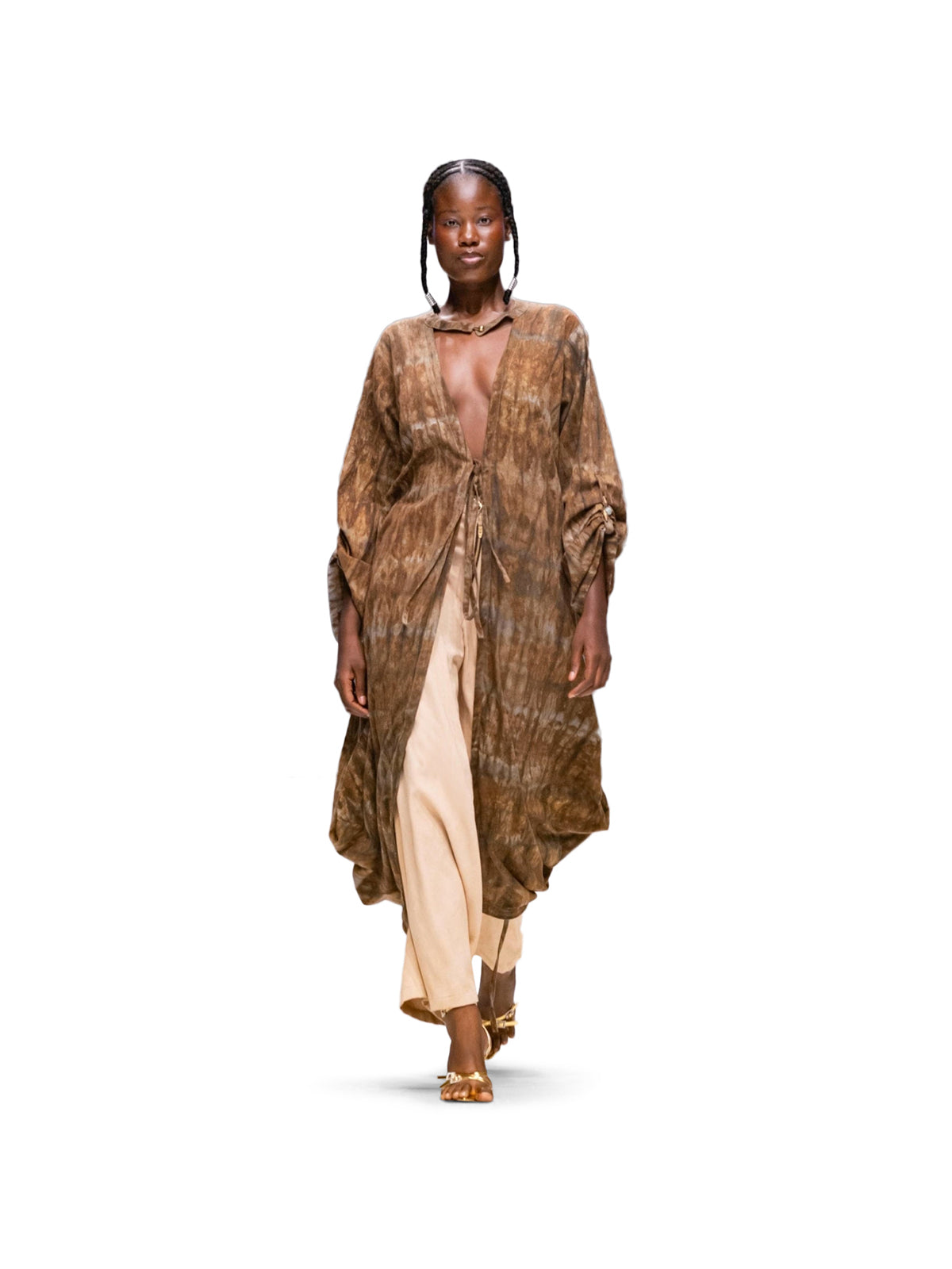 - Gathered sleeves and draped silhouette
