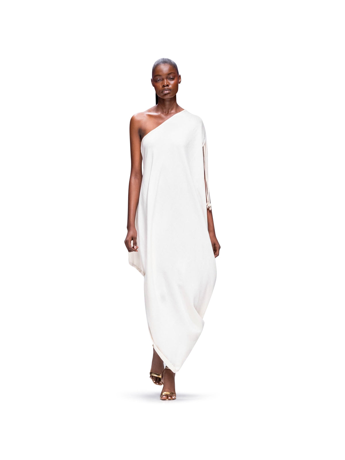 An elegant study in balance, this sari-inspired one-shoulder dress combines structure with softness. Handloomed in Lilabare’s signature weave, it drapes like silk yet maintains the earthy texture of cotton. Long beaded tassels fall from the shoulder, creating graceful movement as you walk. The result is a piece that feels both contemporary and timeless—crafted by hand, made to last. Style with statement earrings and heeled sandals for elevated minimalism.