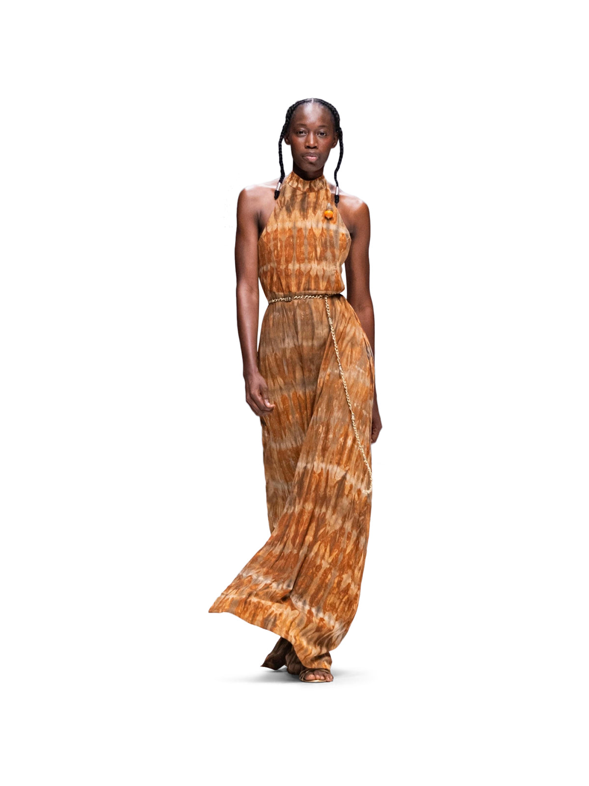 The Printed Halterneck Dress by Lilabare balances structure and ease through thoughtful detailing. The racerfront neckline and open-back silhouette are fastened with long, beaded ties that cascade along the spine, while the button-down A-line form adds subtle movement. Botanically dyed and crafted in-house, the Kali print enhances the silhouette with its fluid, nature-inspired patterning. Pair with strappy sandals and sculptural earrings for a refined summer statement.