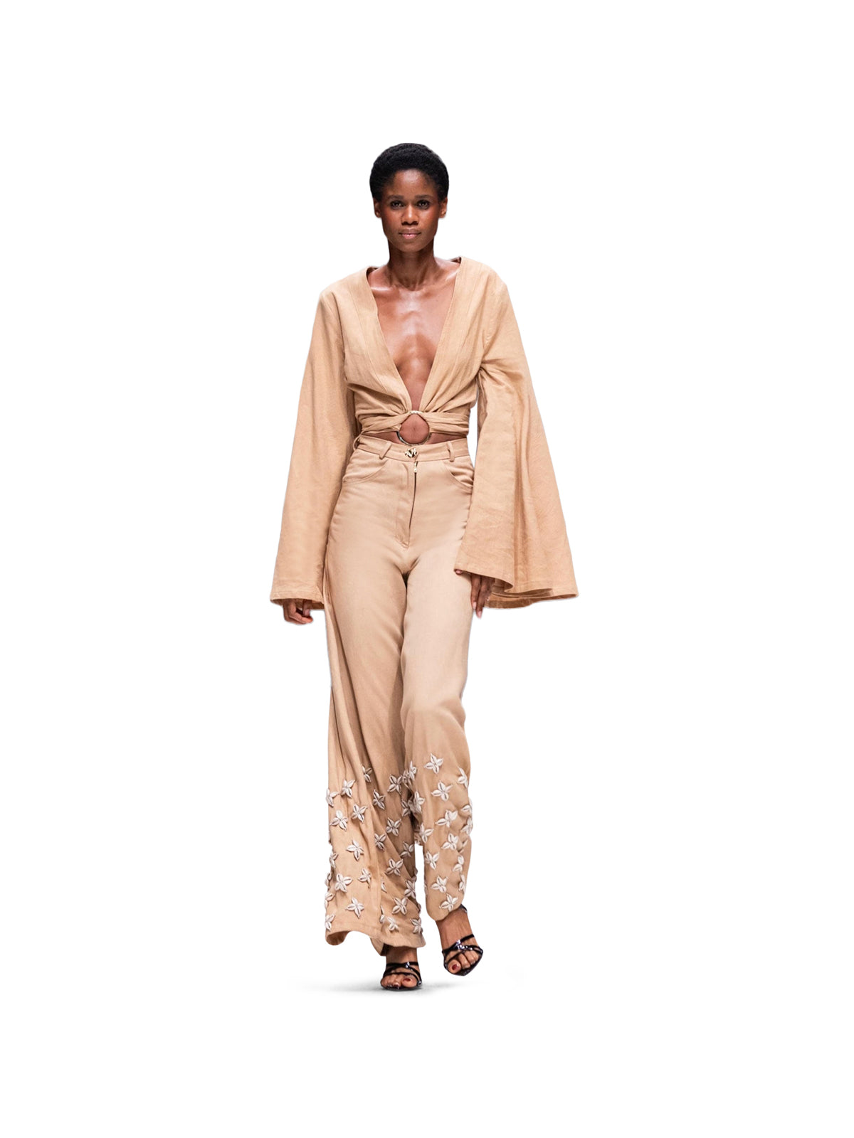 Cut from soft, rain-fed cotton, the Wrap Bangle Top brings movement and versatility to everyday dressing. Its fluid, multiway design features a plunging neckline and voluminous trumpet sleeves, finished with a cropped hem that cinches around the waist. A sculptural brass bangle accompanies the piece, functioning as both closure and adornment — a nod to Lilabare’s signature fusion of craft and functionality. Pair with high-waisted trousers or layer over a slip skirt for effortless versatility.