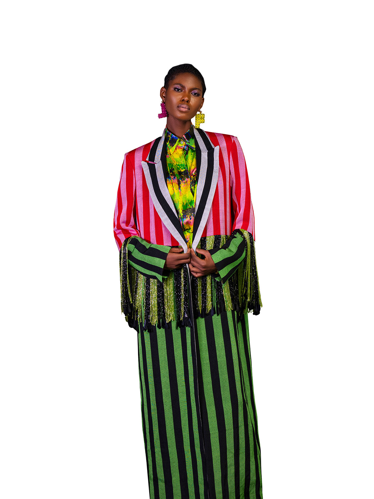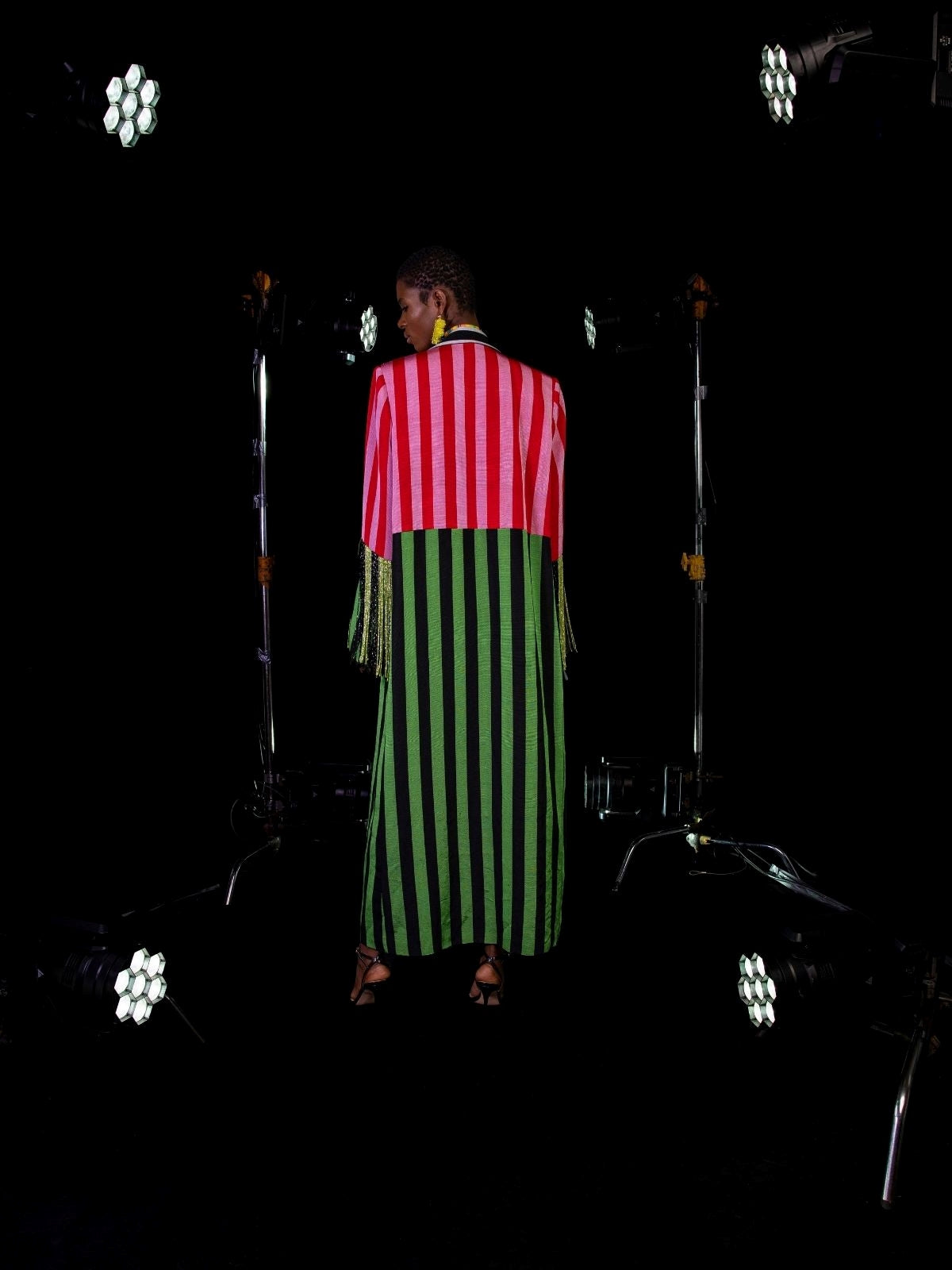 The Akwete Fringe Coat is a bold expression of heritage and movement. Made from hand-woven Akwete fabric, this oversized, maxi-length coat is finished with cascading hand-embellished beaded fringes that catch the light with every stride. A powerful outerwear statement from The Starting Line collection, it blends the artisanal richness of tradition with the energy of forward motion. Adorn it over your favorite dress or pair it with an elegant top and trendy jeans.