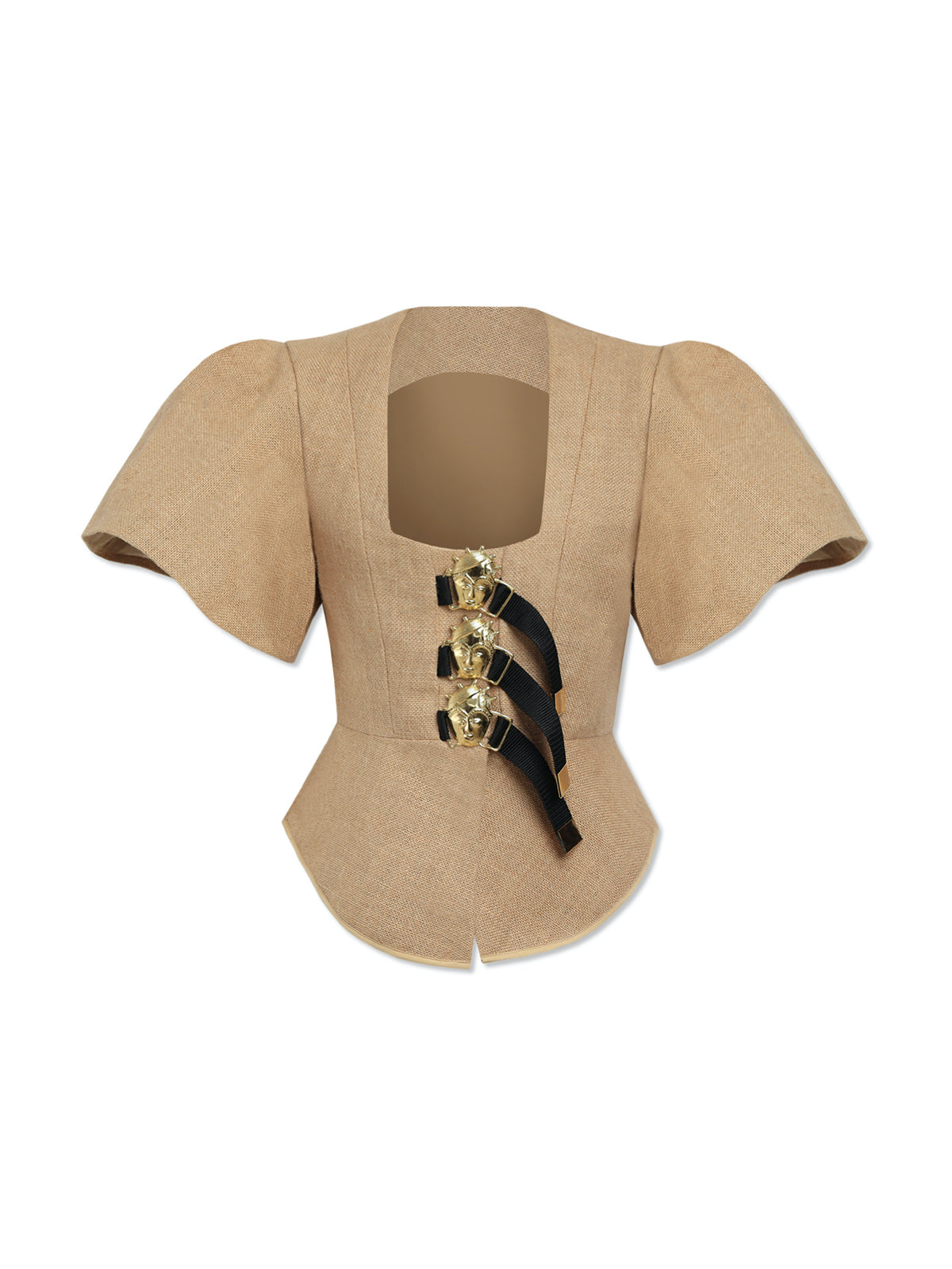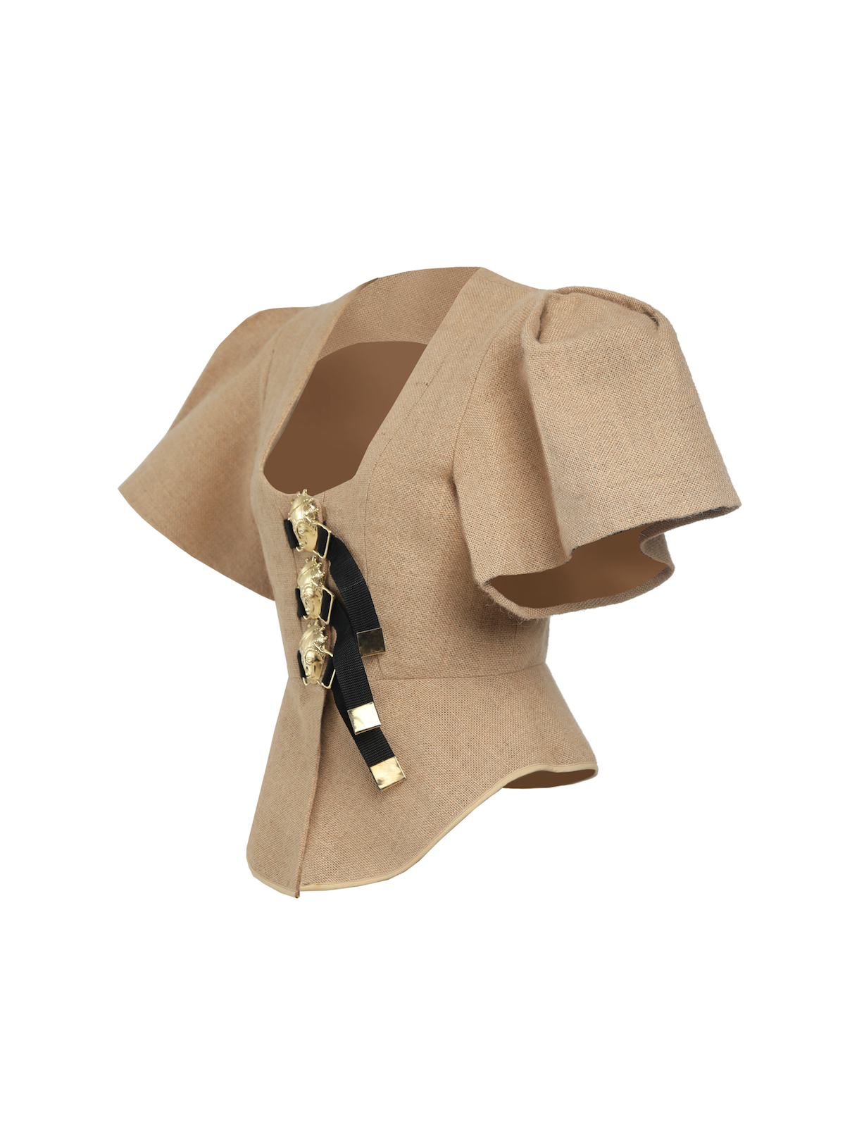 Loza Maléombho’s ready-to-wear collection is unmistakably modern yet steeped in tradition. This Accep Jacket is made from natural fiber burlap and features a fitted silhouette with generous, structured sleeves. The deep square neckline and peplum panels add a refined finish, while the designer’s signature gold-plated bronze details nod to traditional West African masks. Take cues from the brand and style yours with the matching Step Skirt.