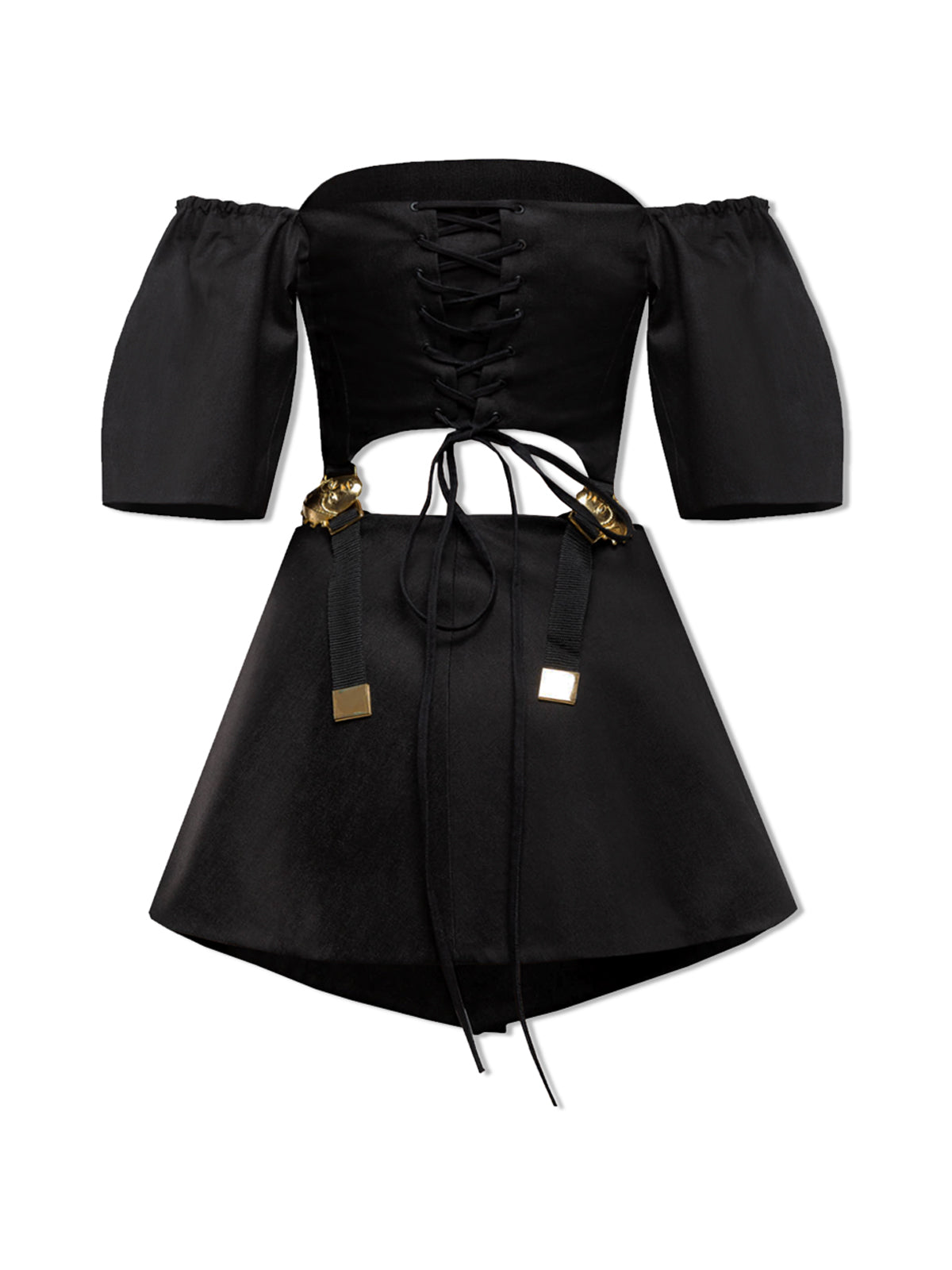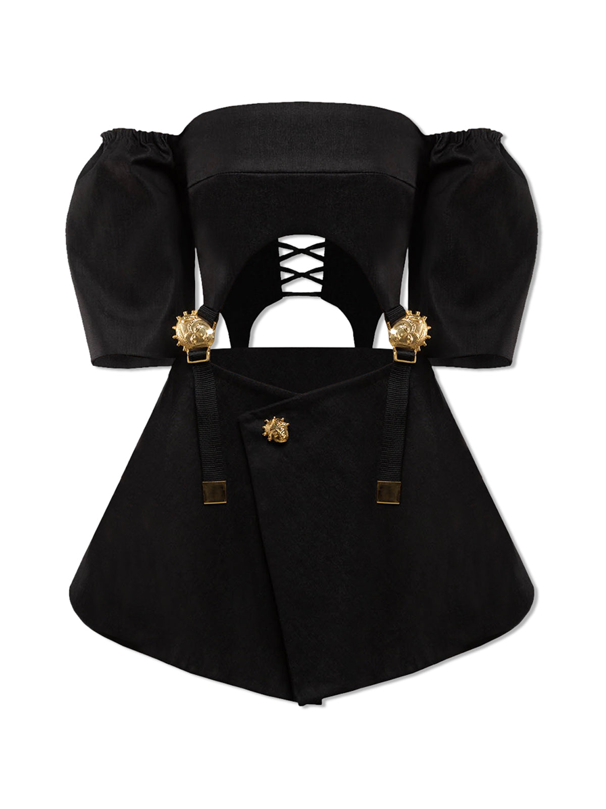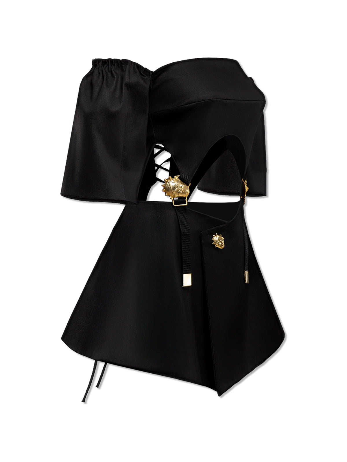 - Off-the-shoulder neckline, short sleeves, pockets, 24-karat gold-plated bronze ornaments, curved hem, zip fastening along back, adjustable buckles