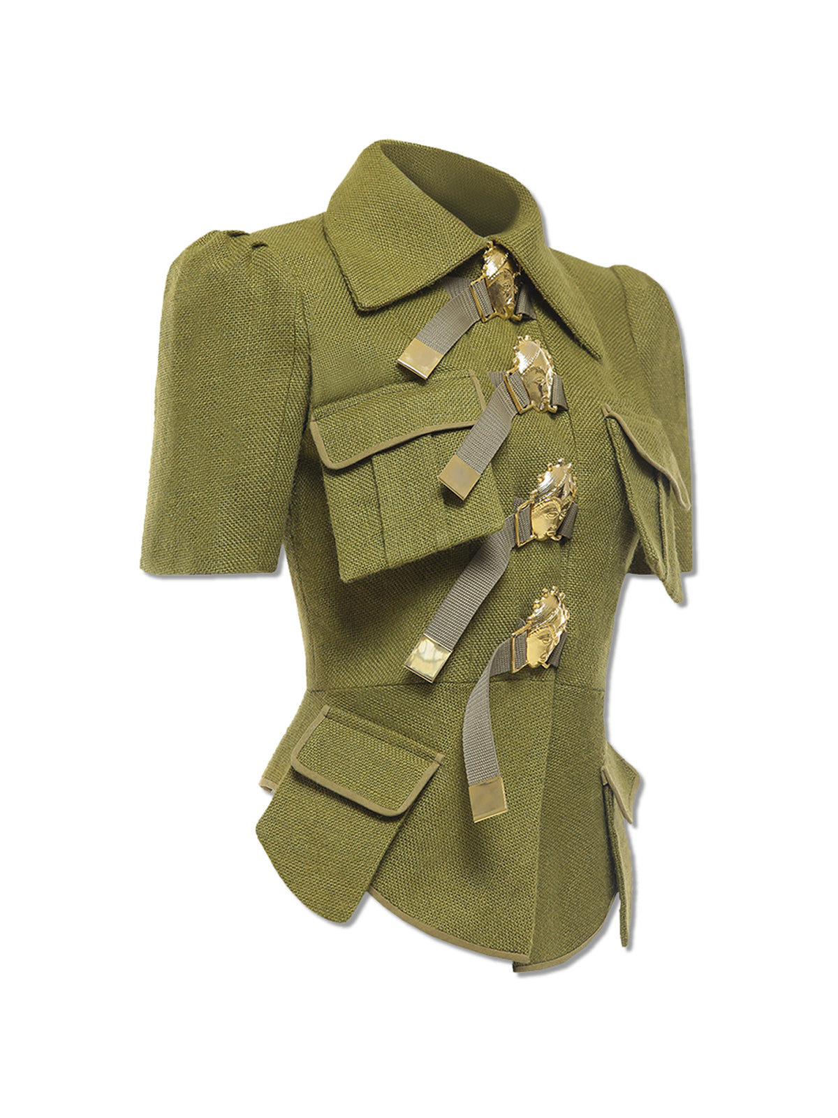 - Pointed collar, short sleeves, pockets, 24-karat gold-plated bronze ornaments, curved hem, buckle closure
