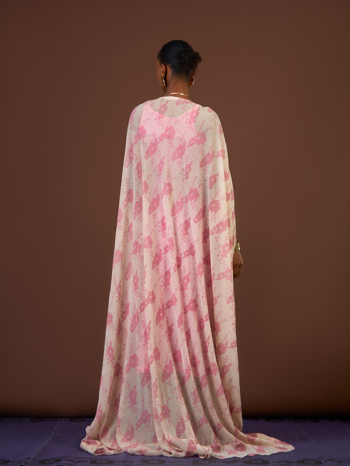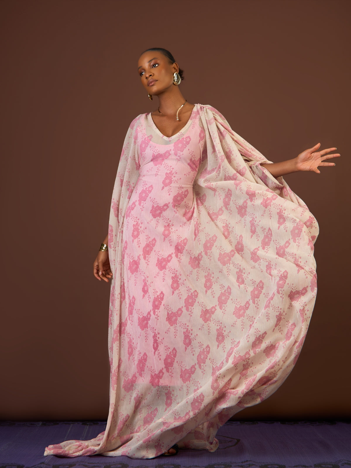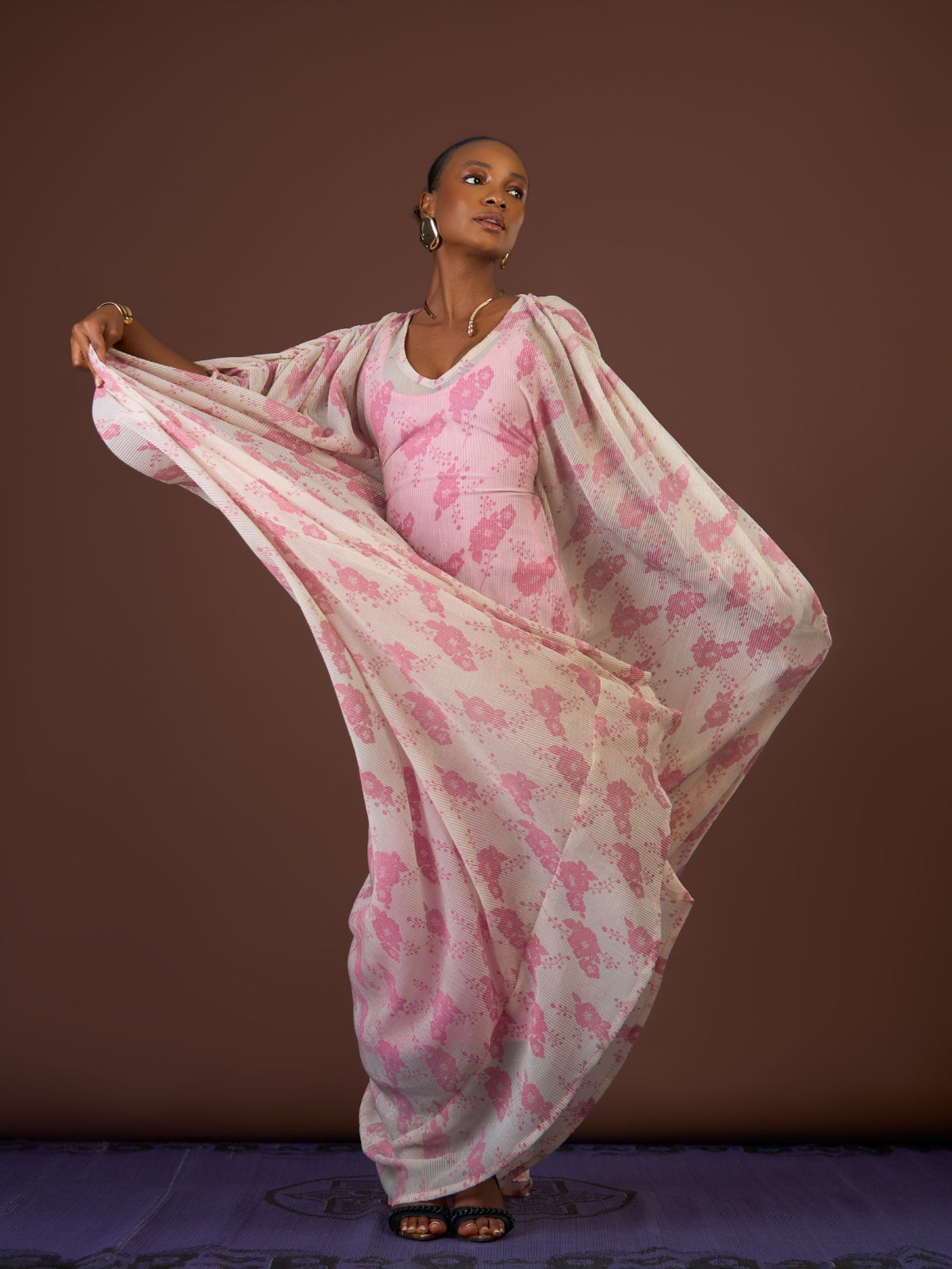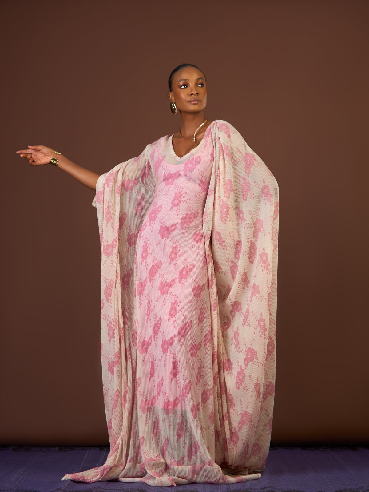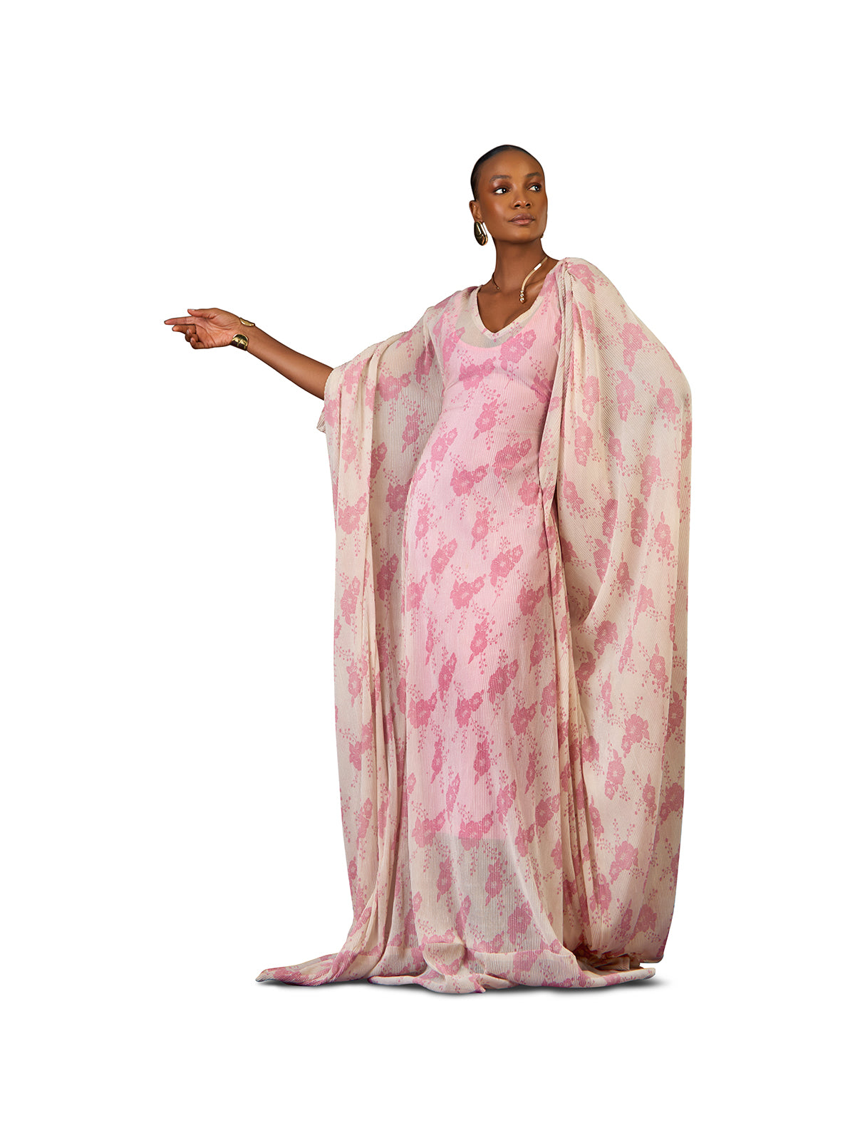 - Flowing printed chiffon kaftan with V-neck and draped sleeves