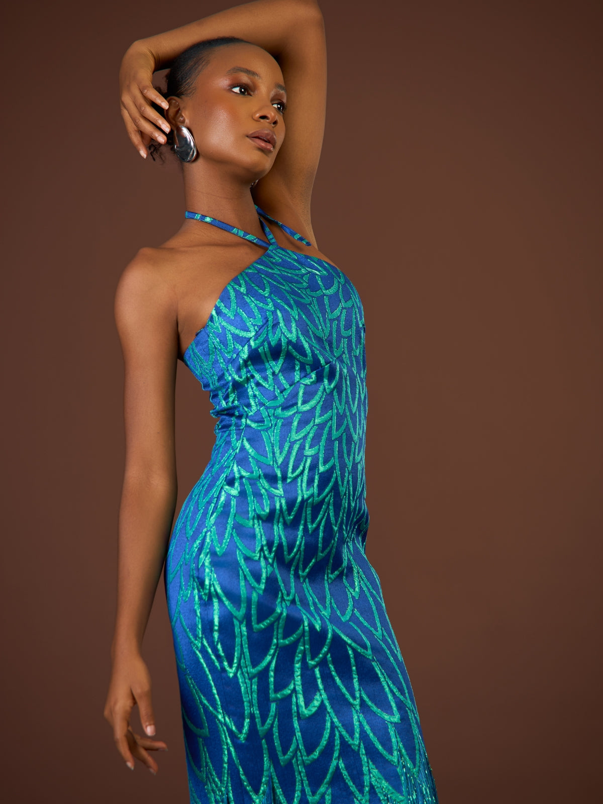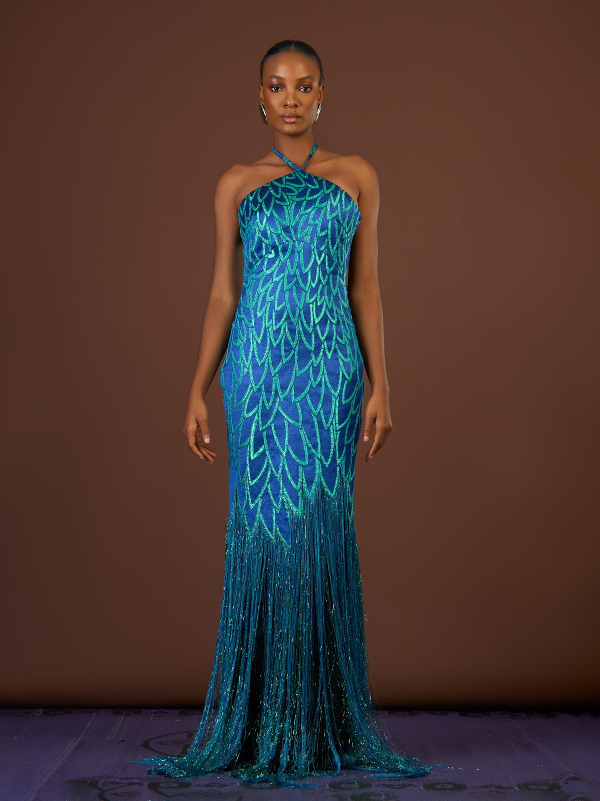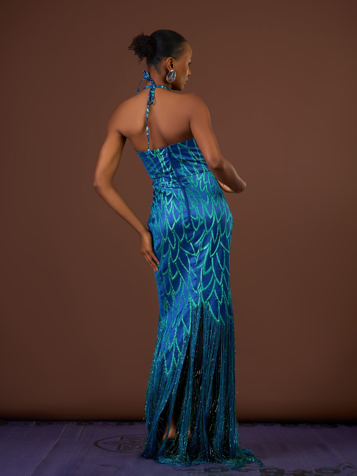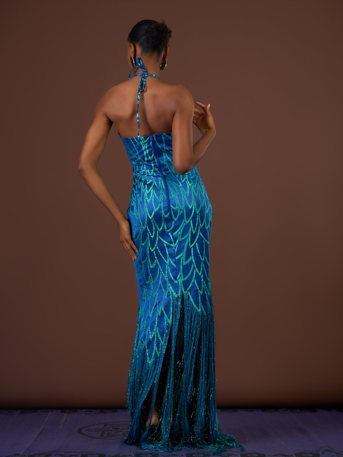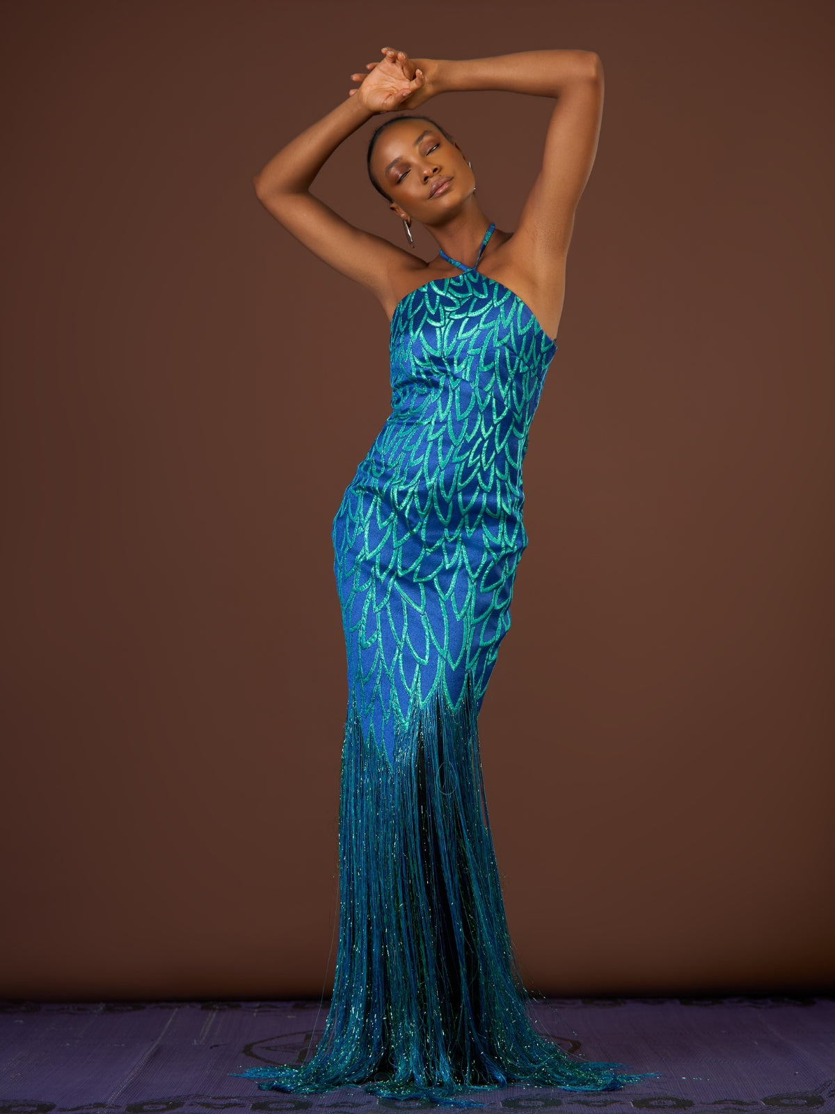 An ode to motion and light, the Azure Tide Dress evokes the shimmer of ocean waves through layered fringe and luminous fabric. Its halter neckline and fitted bodice sculpt the figure, flowing into a fringe-trimmed hemline that moves like water. Crafted from tulle damask with woven motifs, this gown channels cinematic grandeur and artisanal intricacy in equal measure. Let the gown speak — pair with minimal metallic jewelry.