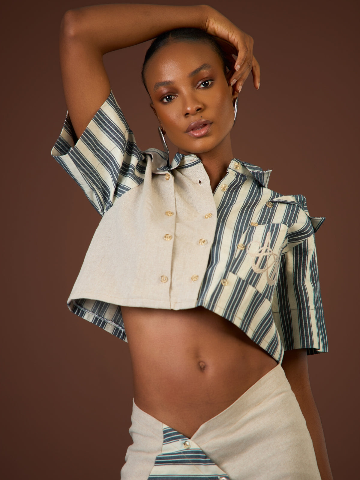 A study in architectural minimalism, the Strata Top reimagines the classic linen shirt through sculptural proportions and layered structure. The cropped silhouette features Maison Àlu’lla’s signature double collar, while striped teal inserts introduce subtle dimension and contrast. An asymmetric hemline and precise paneling highlight the brand’s mastery of form, transforming natural linen into a refined statement of contemporary ease. Pair with the Strata Skirt for a cohesive textural set that balances sharp lines with fluid movement.