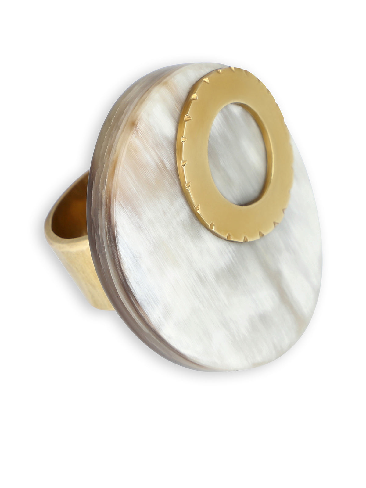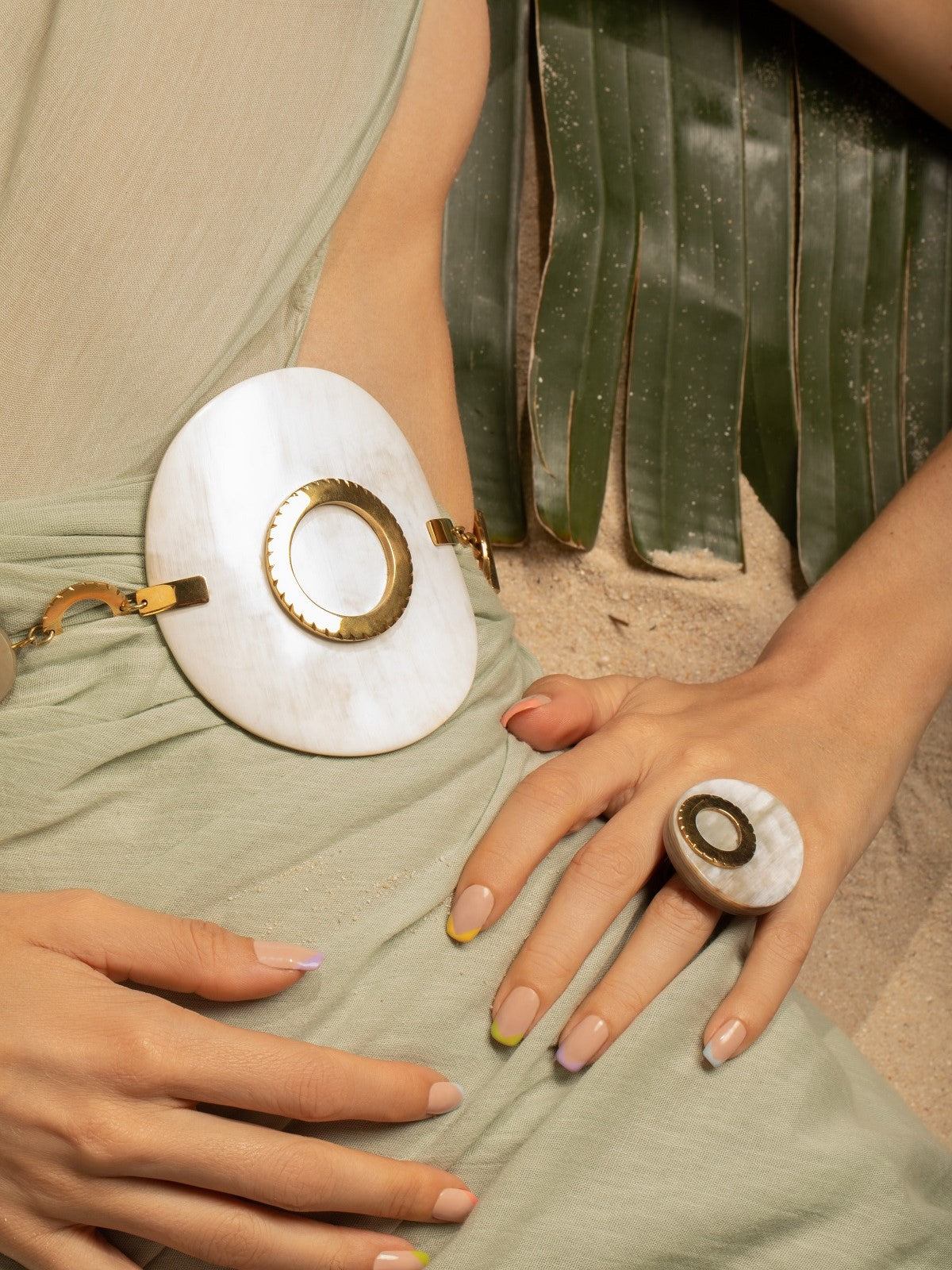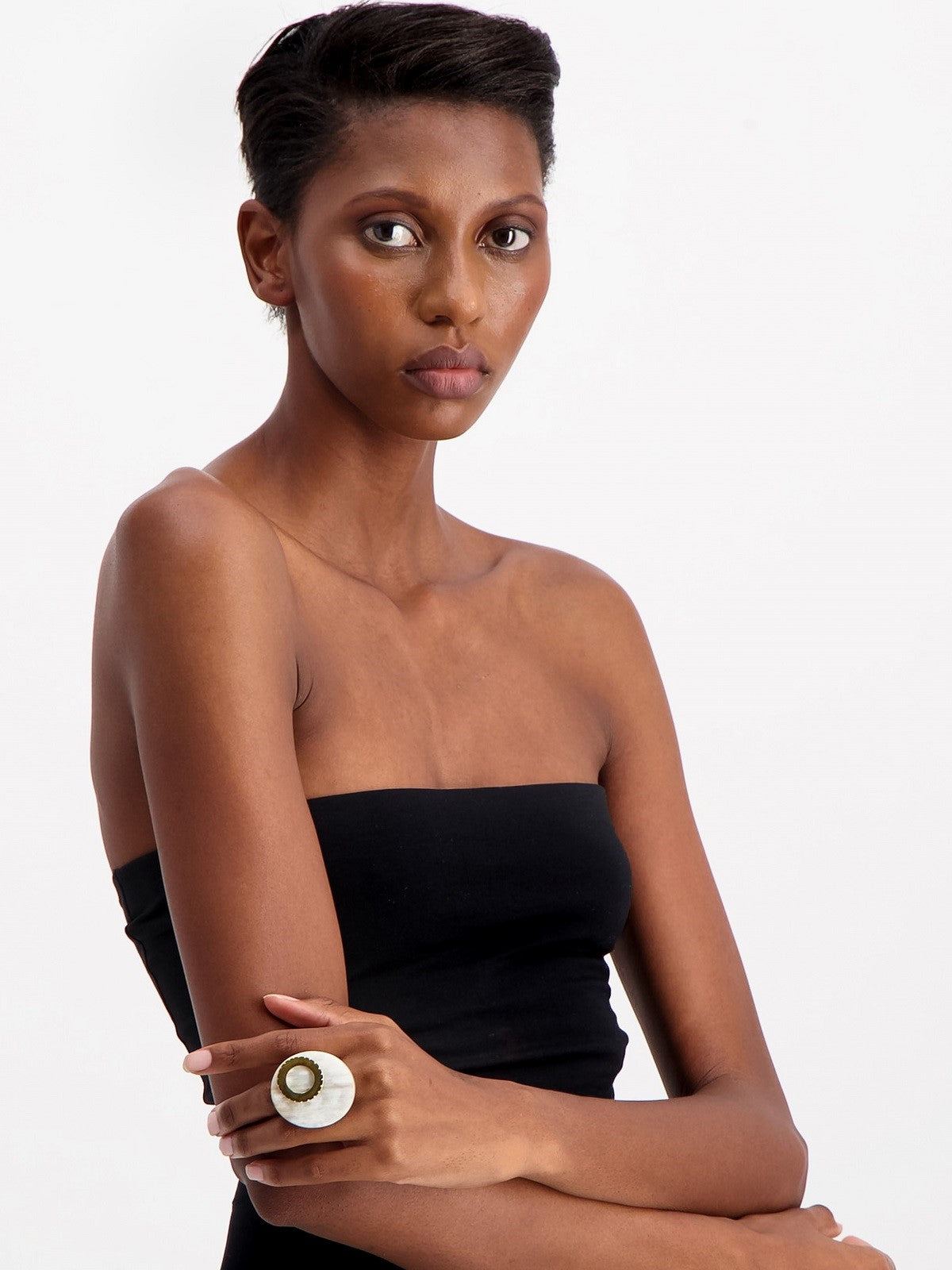 Burundi-based brand Margaux Wong place sustainability at the core of their business—each piece is handmade from recycled, reclaimed, or biodegradable materials, helping reduce fashion’s footprint. This statement ring has been crafted from upcycled cow horn and brass, using leftover pieces from previous collections. Designed to radiate confidence and strength, it looks best solo.