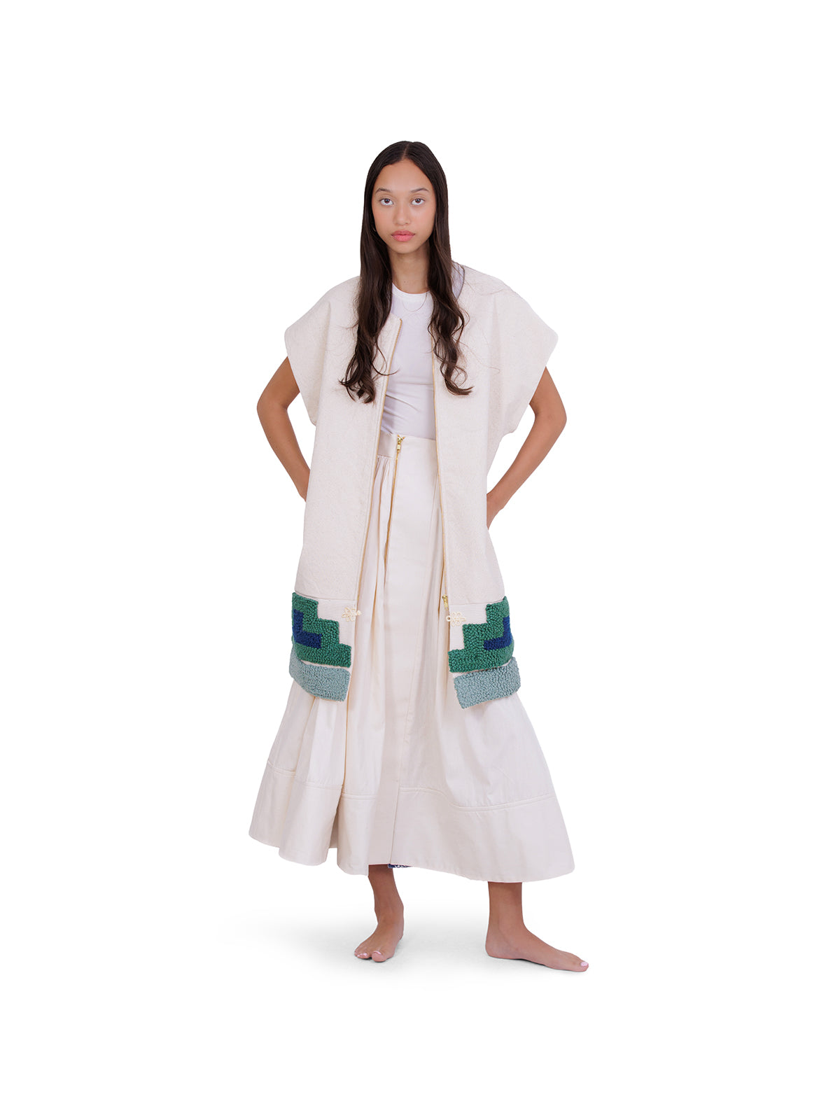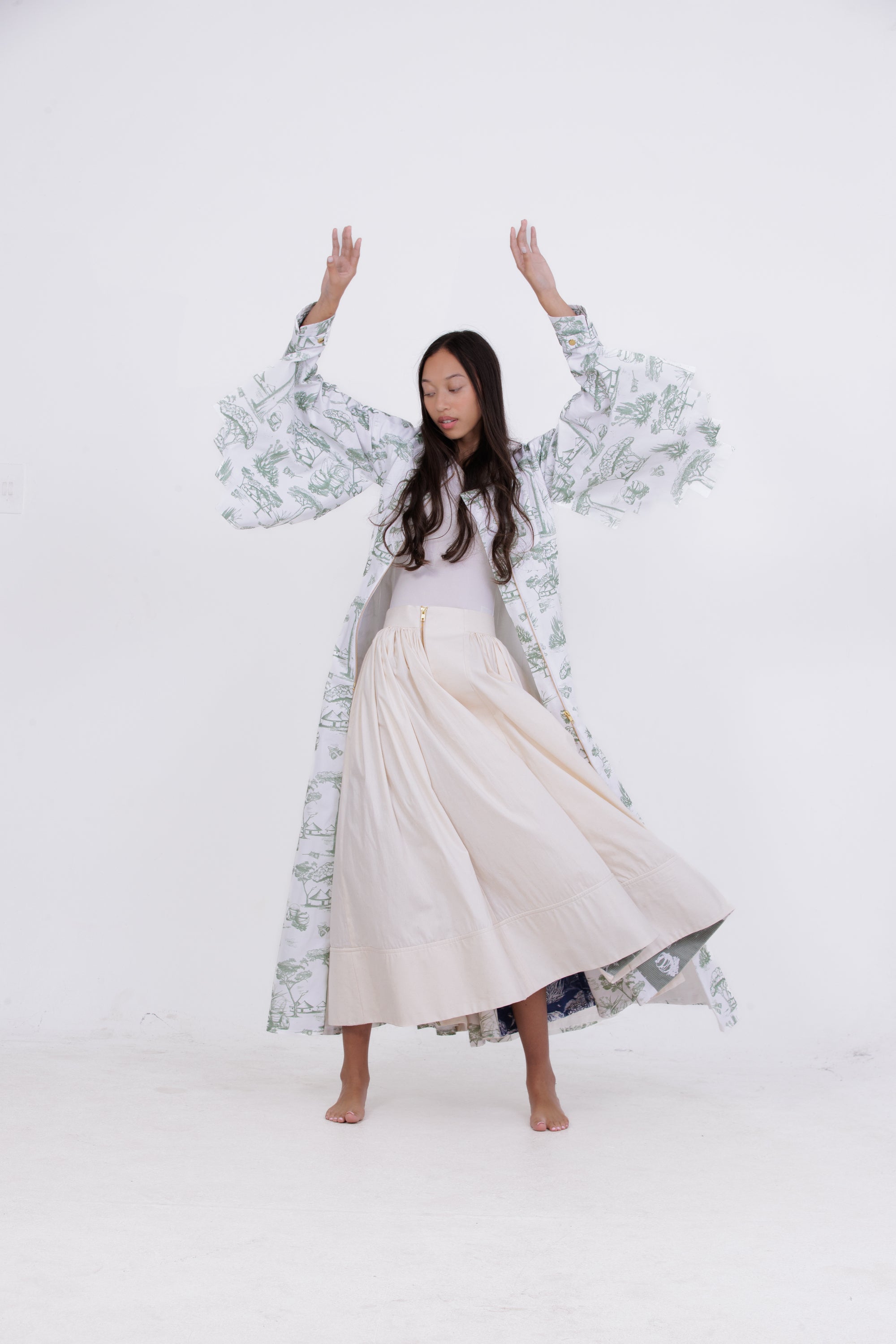 Rooted in heritage and sustainability, Molebatsi’s Crunch Skirt redefines everyday elegance. Cut from ethically sourced cotton, the full A-line silhouette is structured with a stiff center fold and a wide, cinching waistband that flatters the form. The hemline is subtly accented with facing made from upcycled print offcuts of the brand’s Toile du Sud pattern. Wear yours with a fitted Hanfu Sleeve Track Top and heeled sandals.