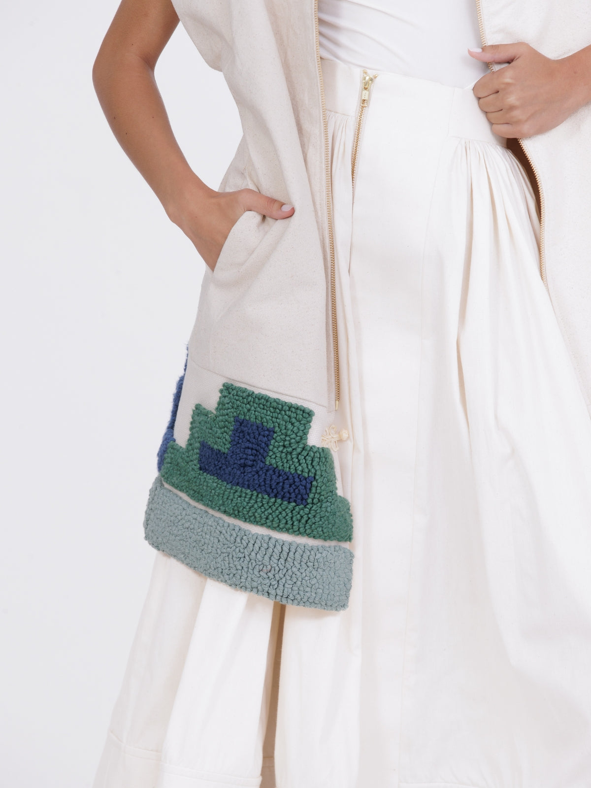 Molebatsi’s Sleeveless Overcoat reimagines the traditional South African Umbaco in bold, minimalist form. Handcrafted from natural cotton canvas by artisans local to the Johannesburg area, the style features tactile punch needle embroidery in vivid blue and green. It's fully lined, with a front zip and a mandarin button detail. Wear it with a flared maxi skirt and crew-neck tee.