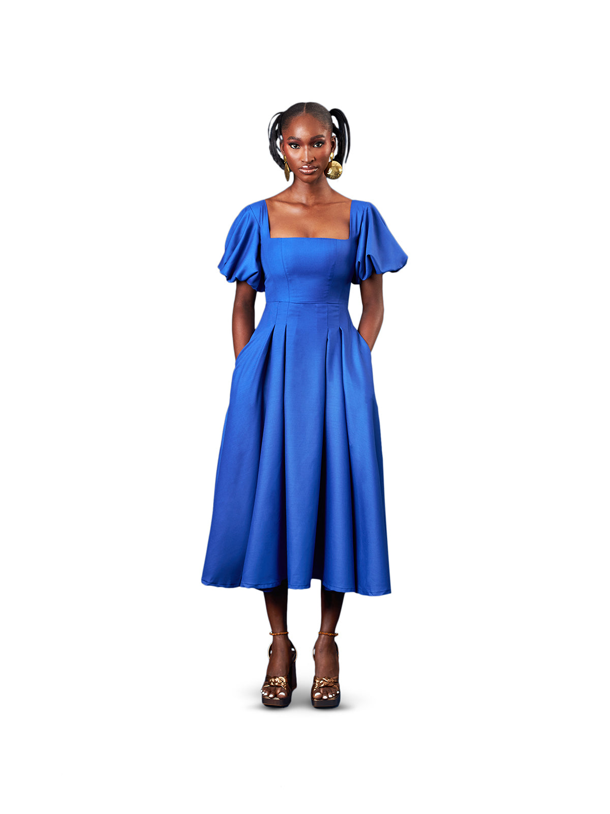 - Square neckline, short puff sleeves, box pleat detailing, pockets, mid-calf length, back zip fastening