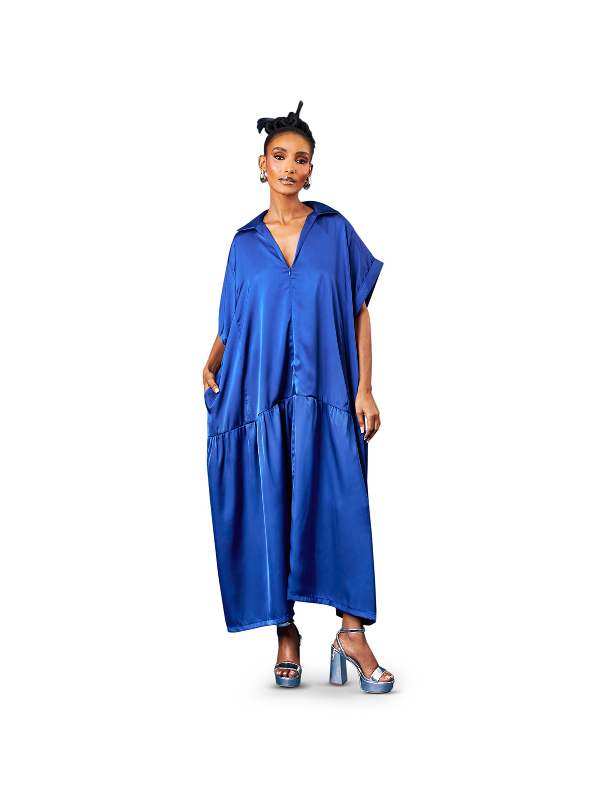 Nigerian label M.O.T explores sculptural silhouettes, tactile textures, and the tension between softness and structure in their collection—beautifully captured by this Elohor Dress. It's crafted from luminous satin in a loose silhouette featuring a notched collar, short sleeves with turned-up cuffs, and a drop waist that falls to a floaty maxi hem. Complete the look with metallic flats and a clutch.