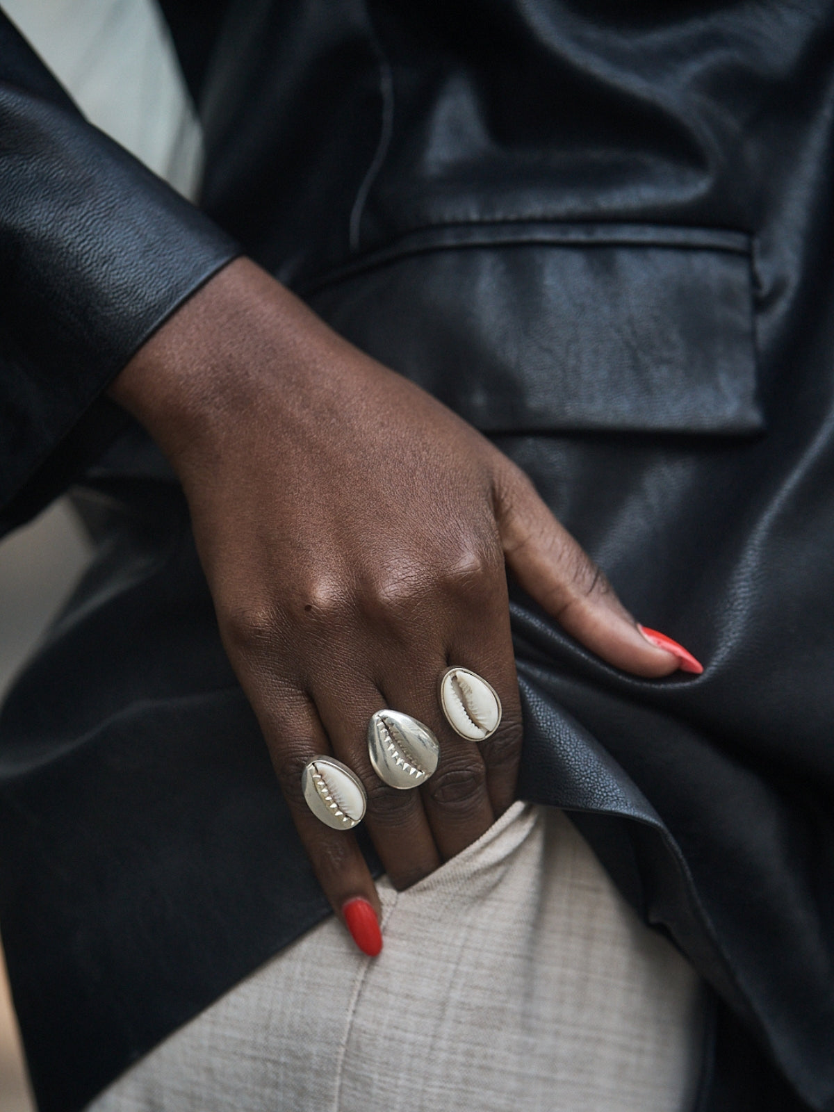 The Tare Ring captures Nkoté’s reverence for symbolism and form, uniting metalwork with heritage. Two sculpted silver cowries and one authentic cowrie shell stretch across multiple fingers, creating a ceremonial line of connection. As part of the Nobility collection, it celebrates both strength and cultural continuity. Let the cowrie faces be visible when the hand rests — pair with minimal bracelets to keep the focus on the multi-finger form.