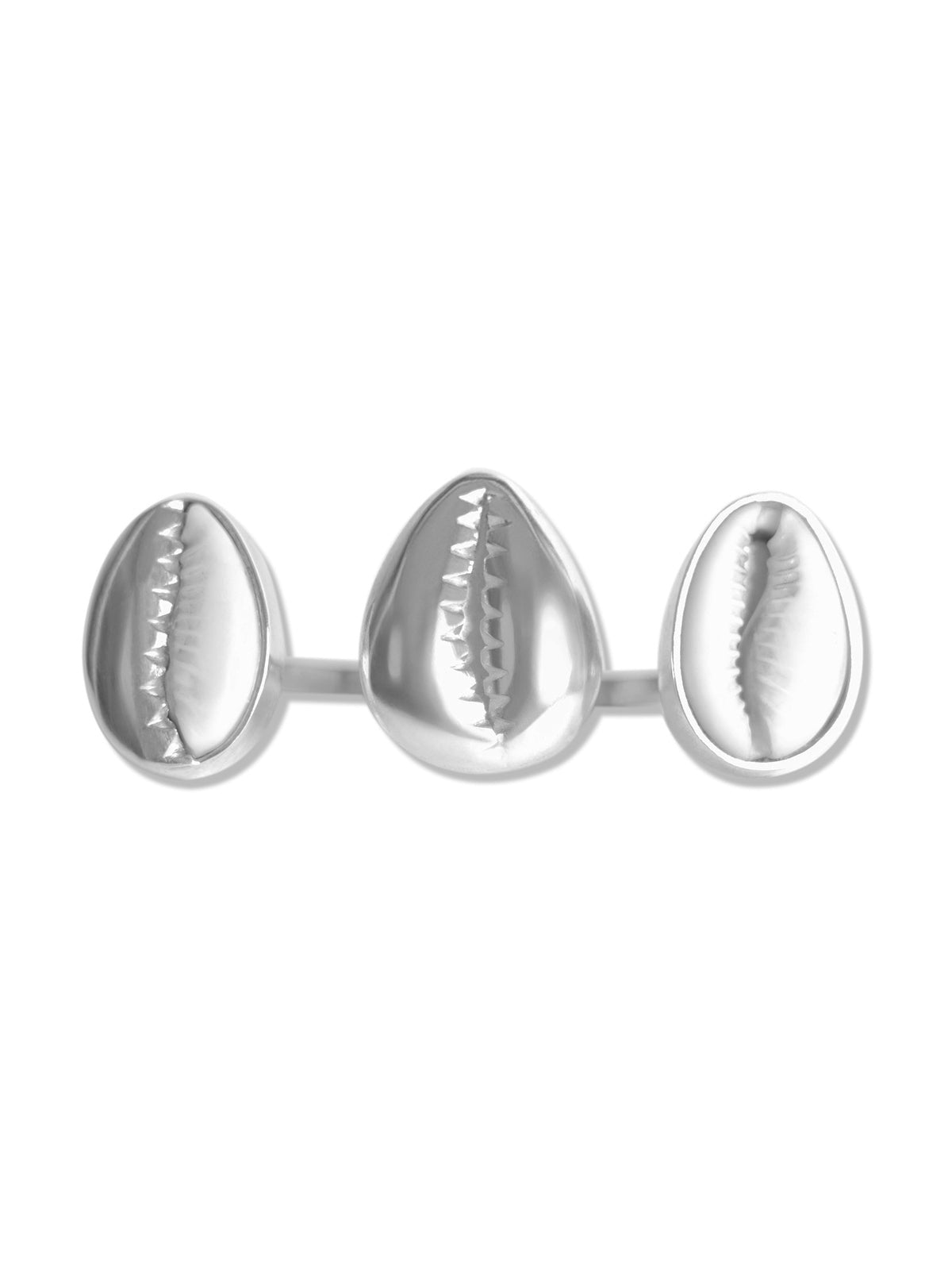 - Single ring formation that bridges adjacent fingers with three focal cowrie elements