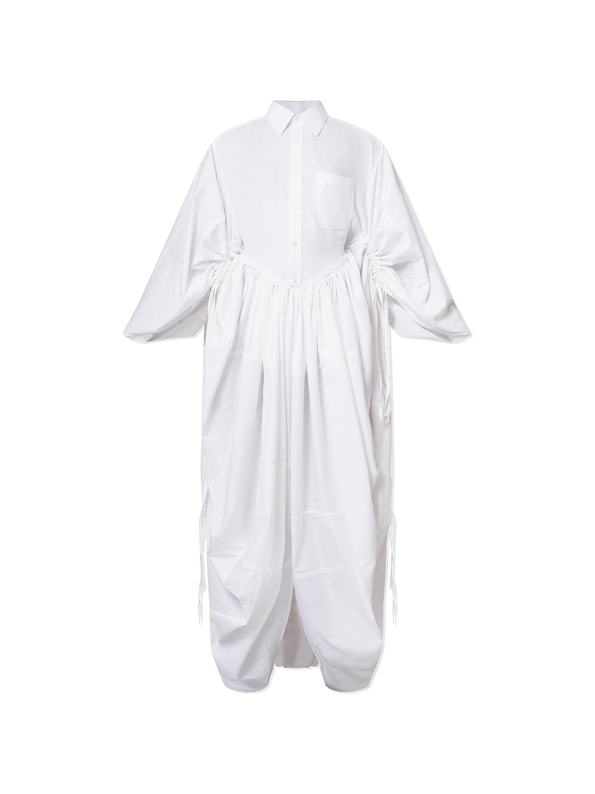 Inspired by classic menswear shirting, NKWO’s Badawin Kaftan Dress showcases the brand’s love of dramatic silhouettes. It’s cut from an upcycled cotton blend and features a sharp pointed collar, an empire waistline, and a generous front slit. Light and airy, the voluminous shape can be adjusted with a simple tweak of the ties. Wear it to the office or on evenings out.