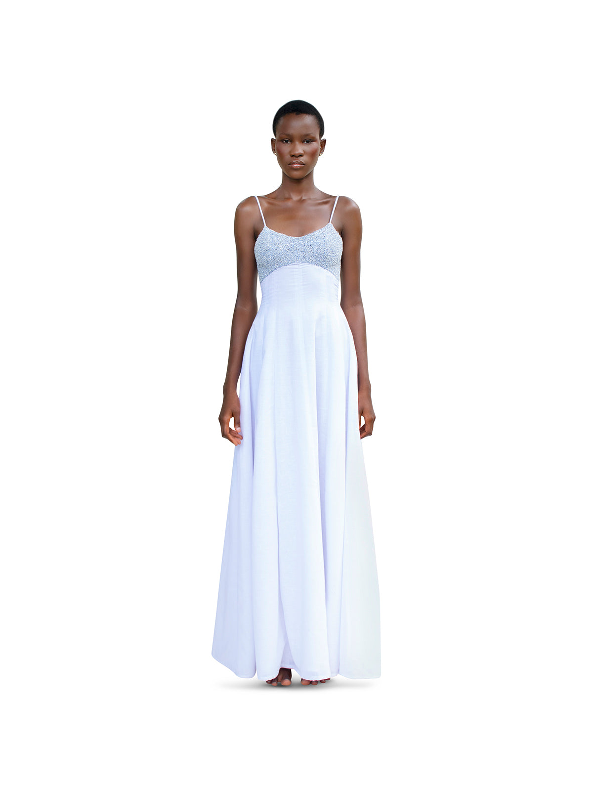 - Linen maxi dress with hand-beaded bust detail