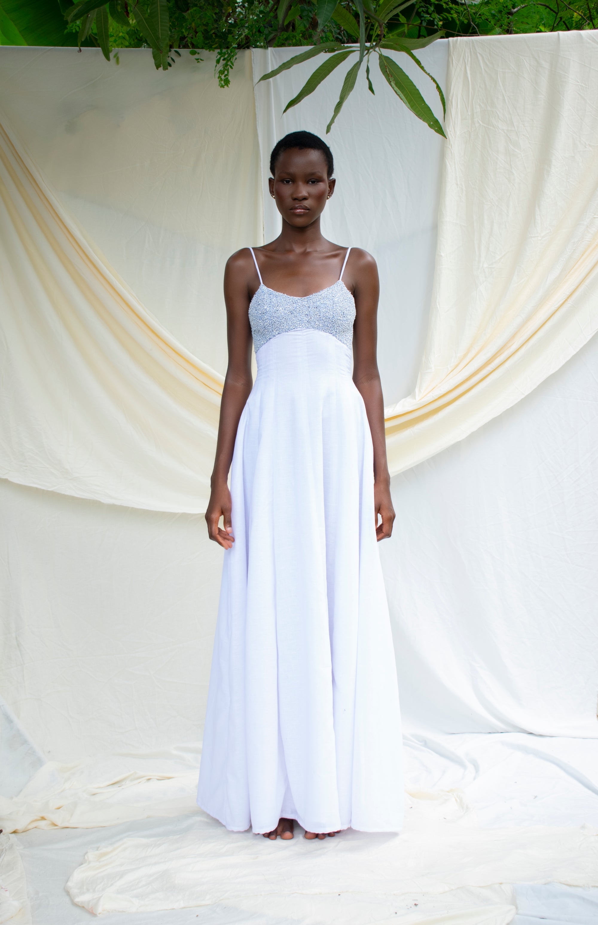 A timeless study in texture and craftsmanship, the Beaded Linen Dress celebrates restraint and refinement. The fully lined silhouette features a form-sculpting bust adorned with delicate tambour beading, each embellishment hand-applied by Lagos artisans. Adjustable straps and a flowing maxi length lend a sense of graceful ease to this grounded yet elevated design. Style with gold earrings and heeled mules for timeless evening simplicity.