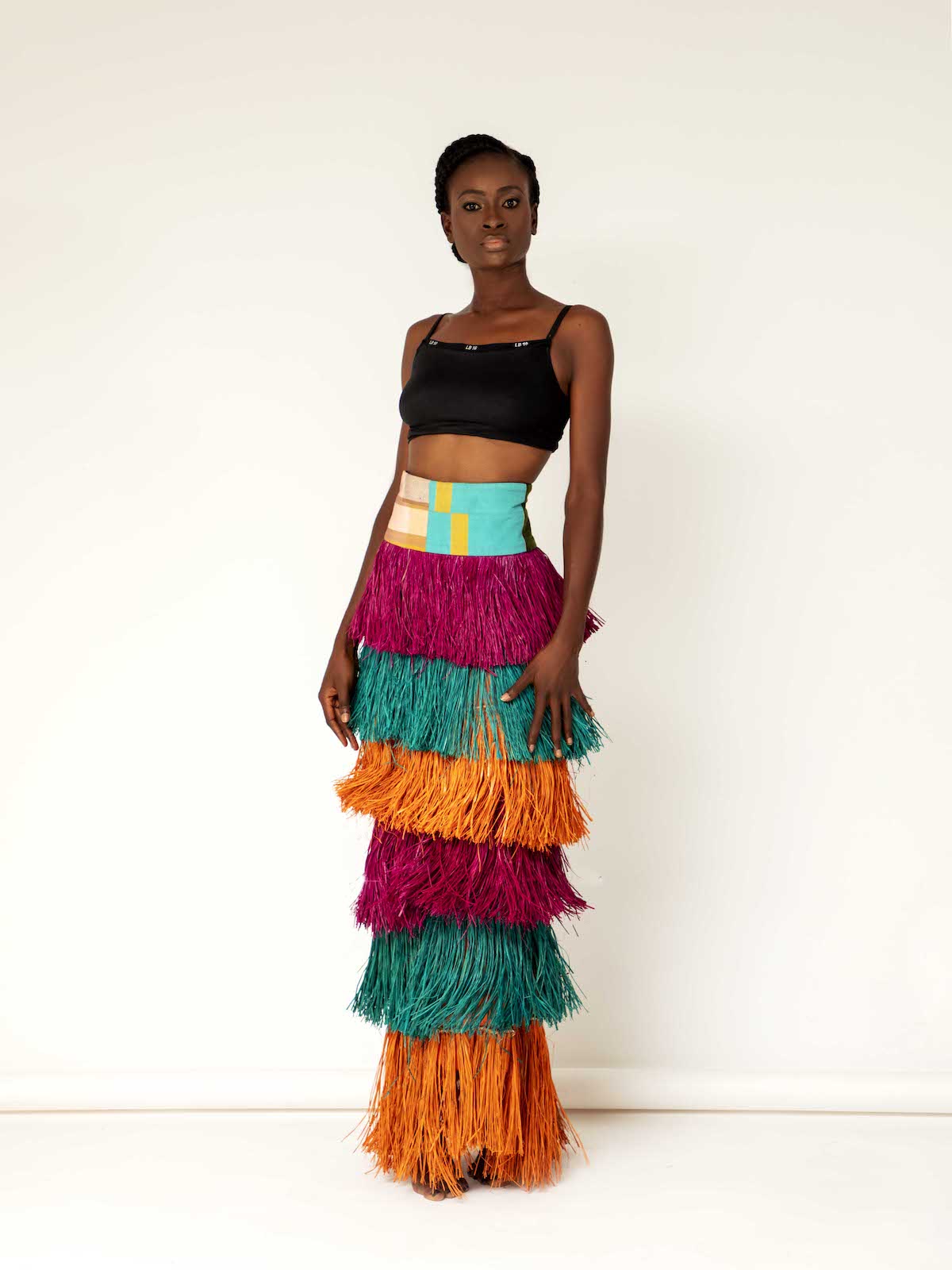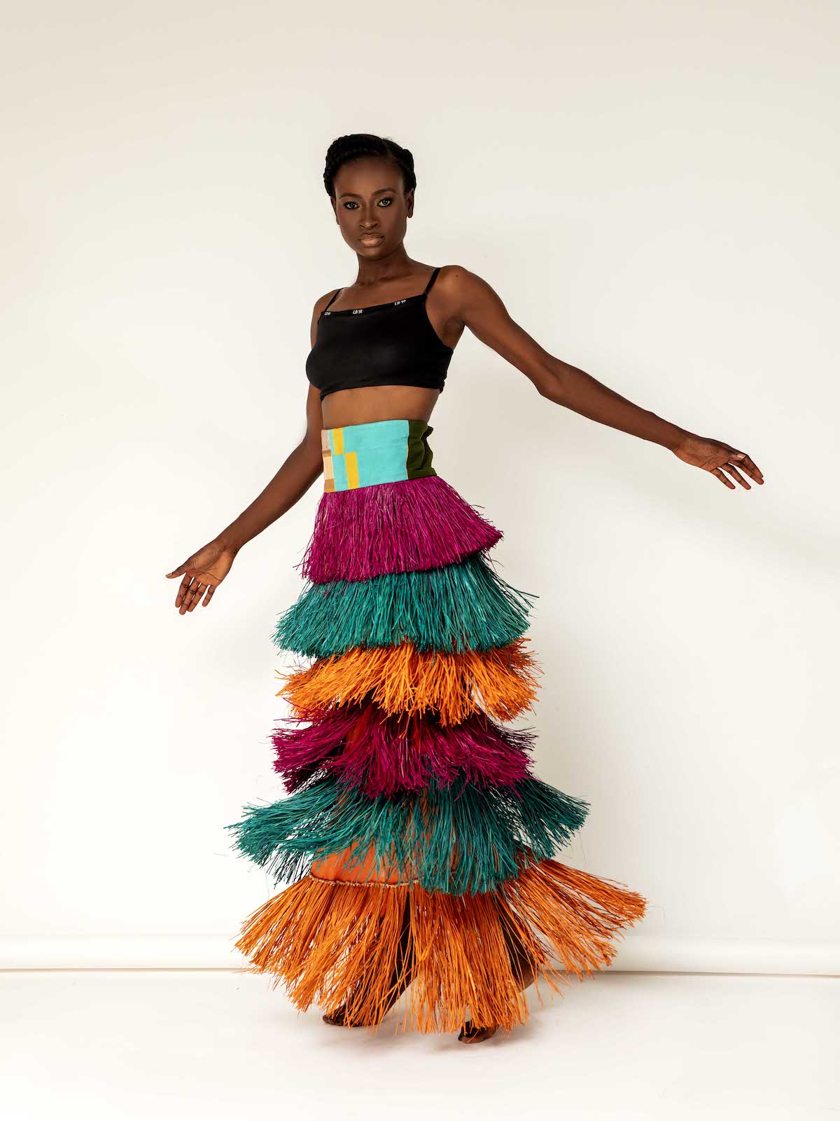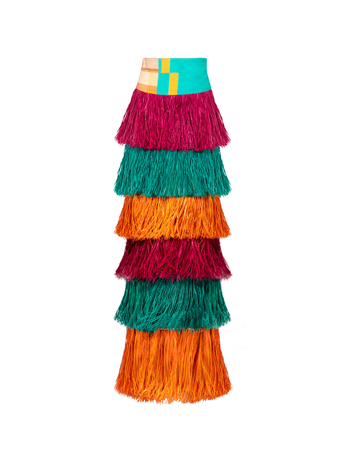 Cynthia Otiyo-Abila founded her eponymous brand in 2016 to bridge the gap between traditional Nigerian craftsmanship and empowered modern glamour. This skirt has a playful tiered silhouette hand-sewn from panels of artisanally dyed raffia. The color-block design encapsulates the joyful mood of the season—style it with a tonal sweater or your favorite tee.