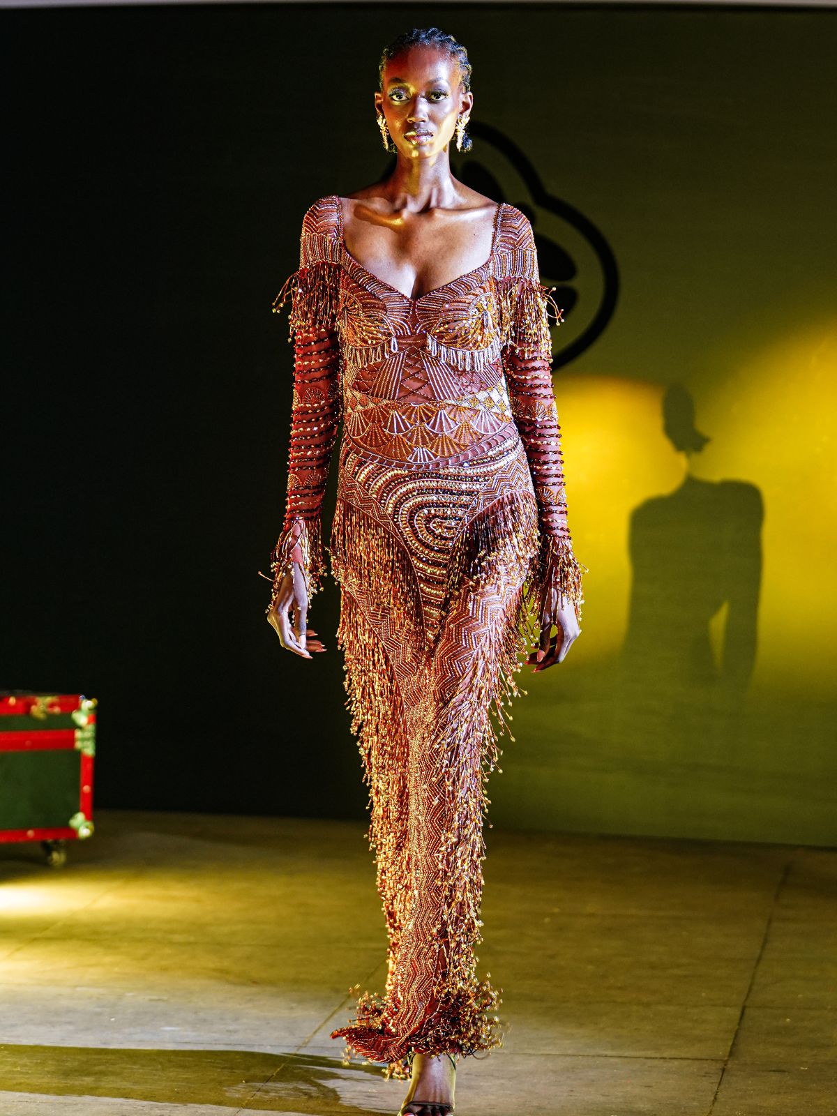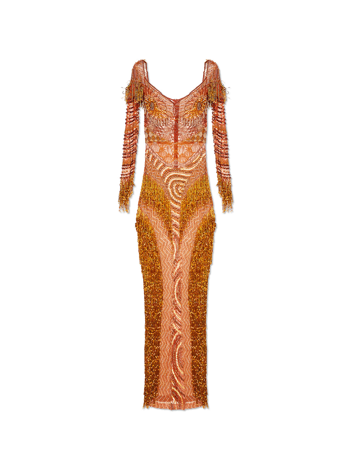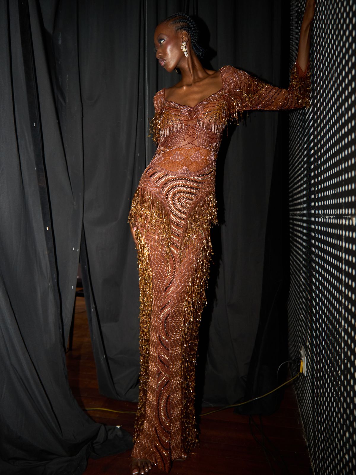 Alana is an ode to endurance, rendered as a brown mesh maxi dress traced with constellations of beads that shimmer like molten bronze on skin. The long, column-like silhouette is designed to elongate and contour, offering a close yet comfortable fit that feels both protective and sensual. Pair with sculptural earrings and strappy heels for a look that merges armour with allure.