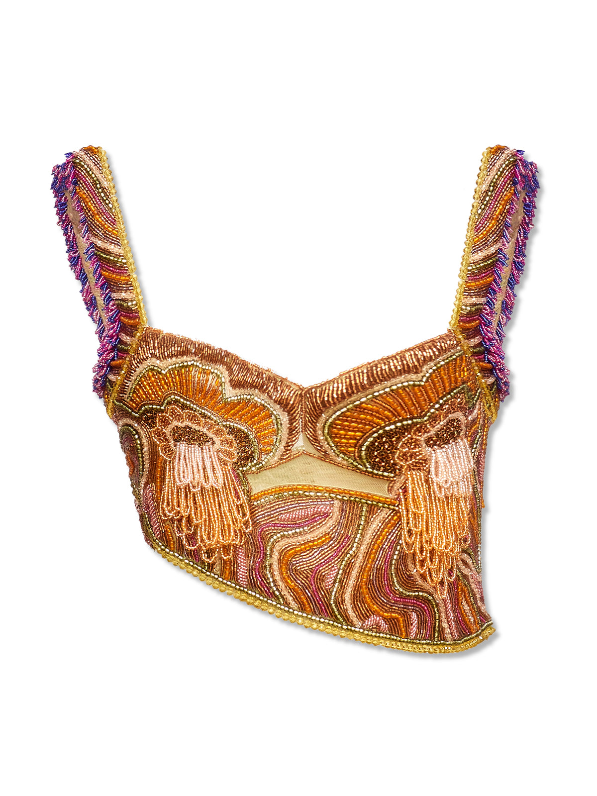 The Iris Crop Top mirrors the skirt’s beaded exuberance, cropped just above the waist to reveal a sliver of skin between bands of colour. Cut close to the body, it balances playfulness with precision. Style as a set with the Iris Mini Skirt, or wear with high-waisted tailoring for a more tempered celebration.