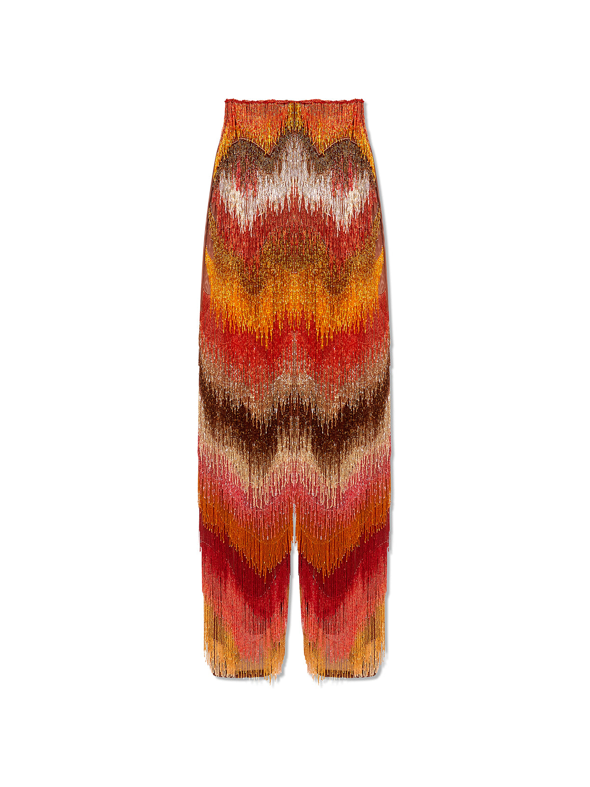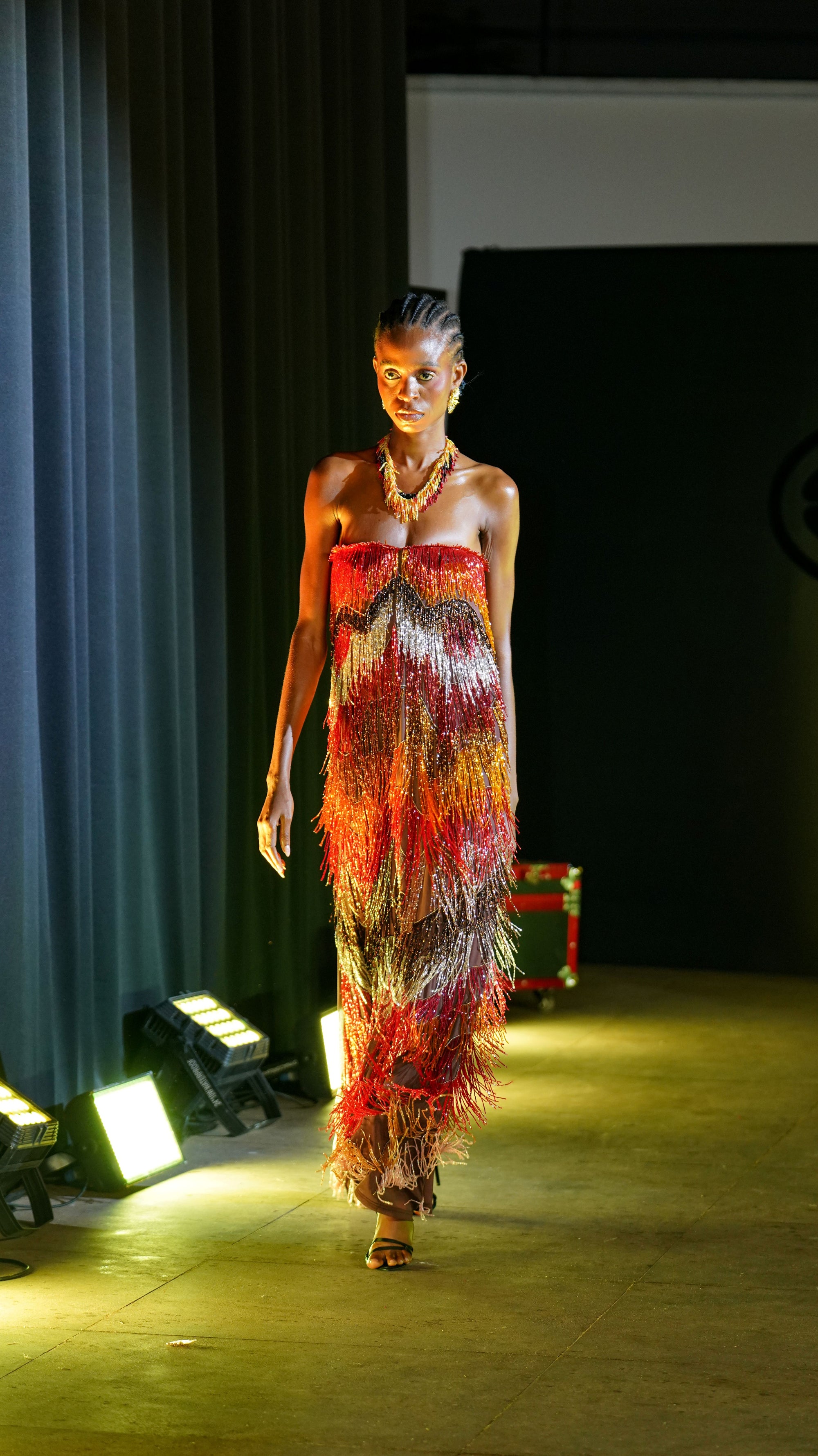 The Jua Jumpsuit translates the collection’s language of scar and protection into a one-piece statement, its multicolor beadwork and mesh mapping the body in vertical lines. The tailored upper and fluid leg create a powerful yet wearable profile. Style with minimal heels and jewellery for a look that feels like modern-day ceremonial armour.