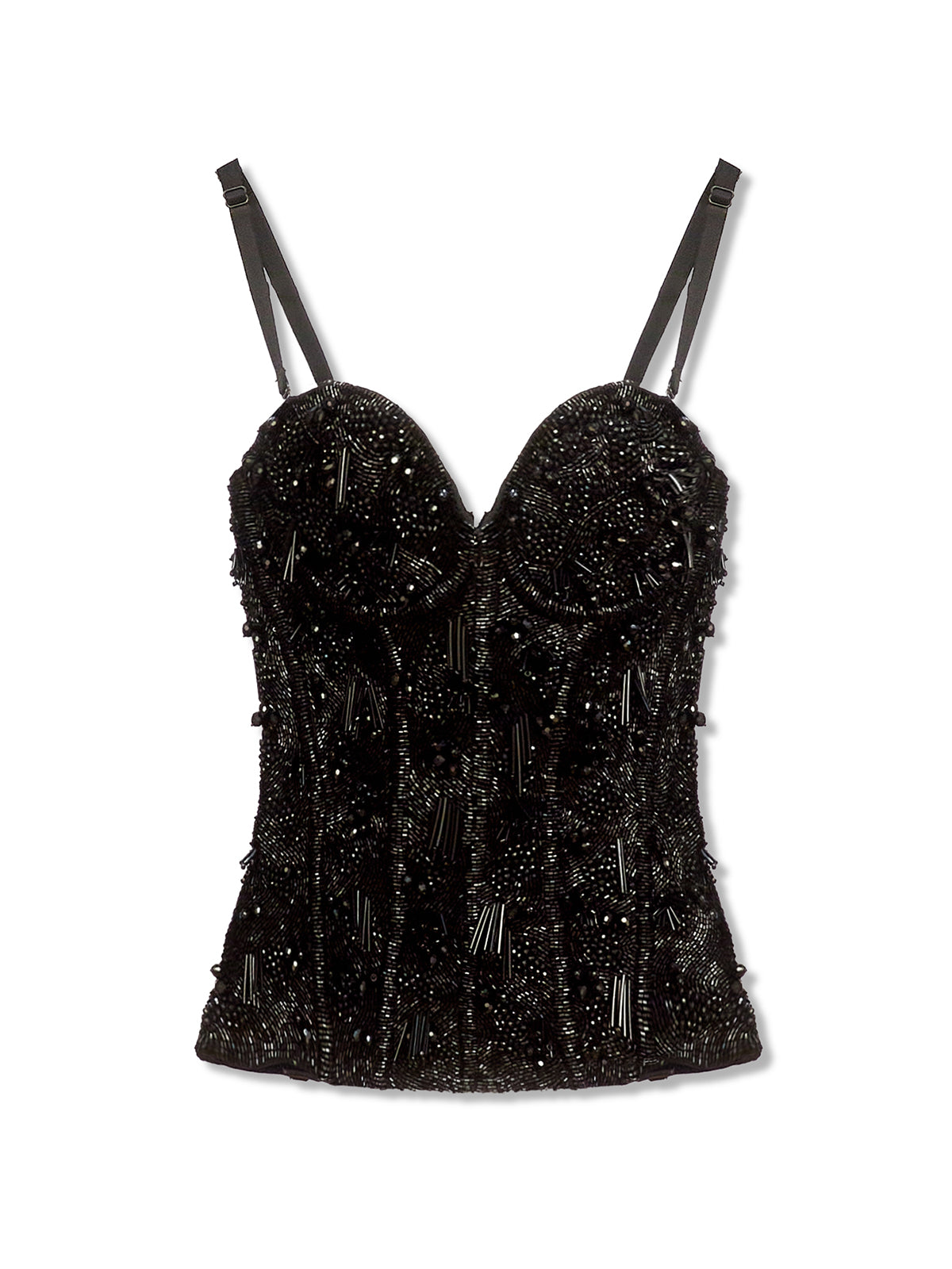 The Lela Corset is a sculpted shell of beads, fabric, and mesh, framing the torso like contemporary armour. Designed to contour and support, it brings sharp structure to the collection’s fluid skirts and trousers. Style with the Lela Floor Length Skirt for high drama, or temper with wide-leg pants for a modern, city-ready take.
