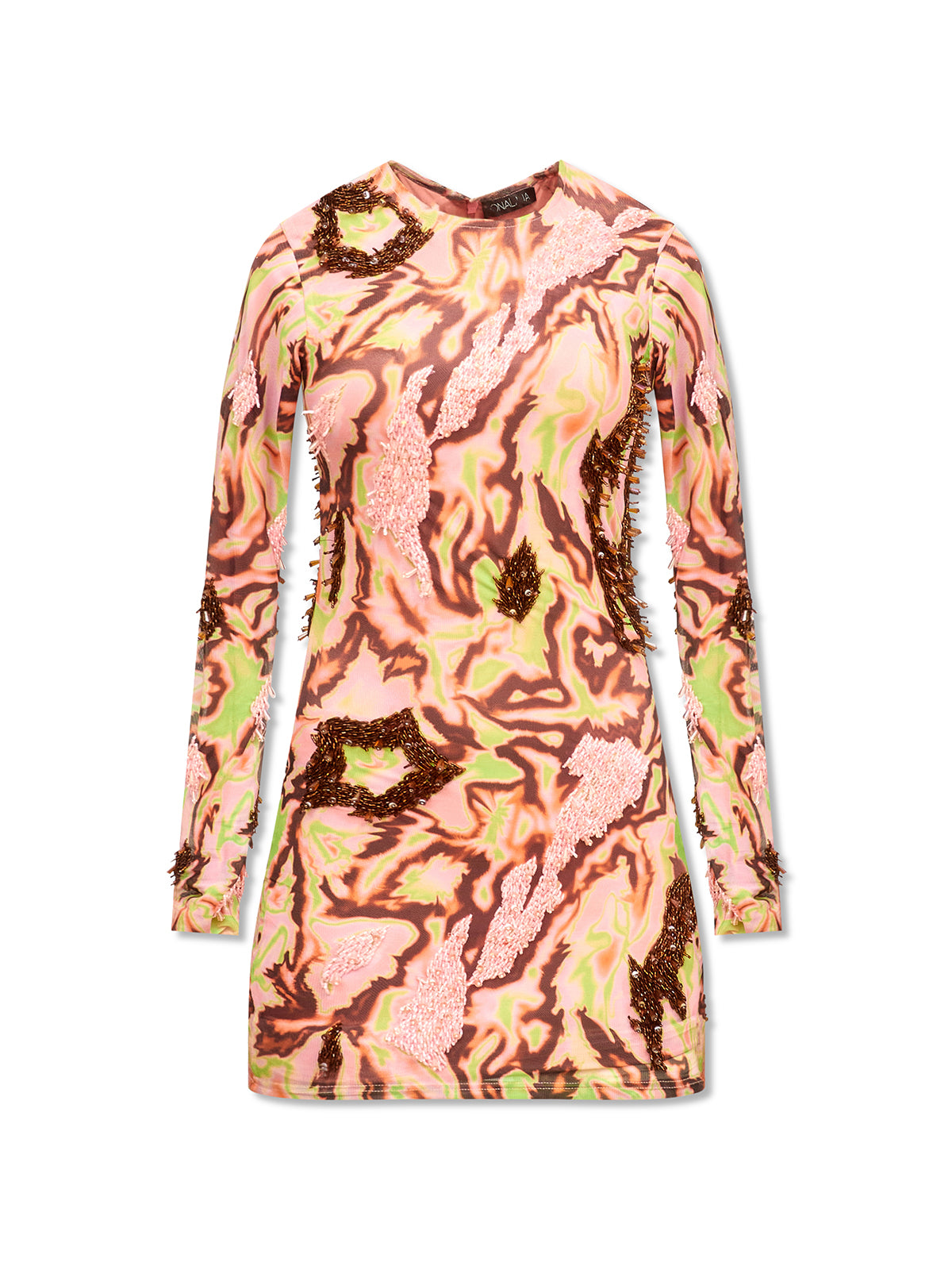 Rendered in luminous pink, the Zusi Mini Dress makes MARKED’s language of scar and constellation feel playful yet potent. Its short length and close fit spotlight the beadwork, creating a jewel-like effect around the body. Pair with strappy heels and minimal jewelry for a celebratory, high-impact look.