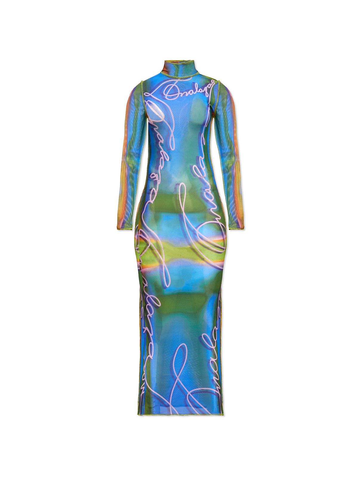 - Blue mesh dress with hand-applied motif inspired by written script