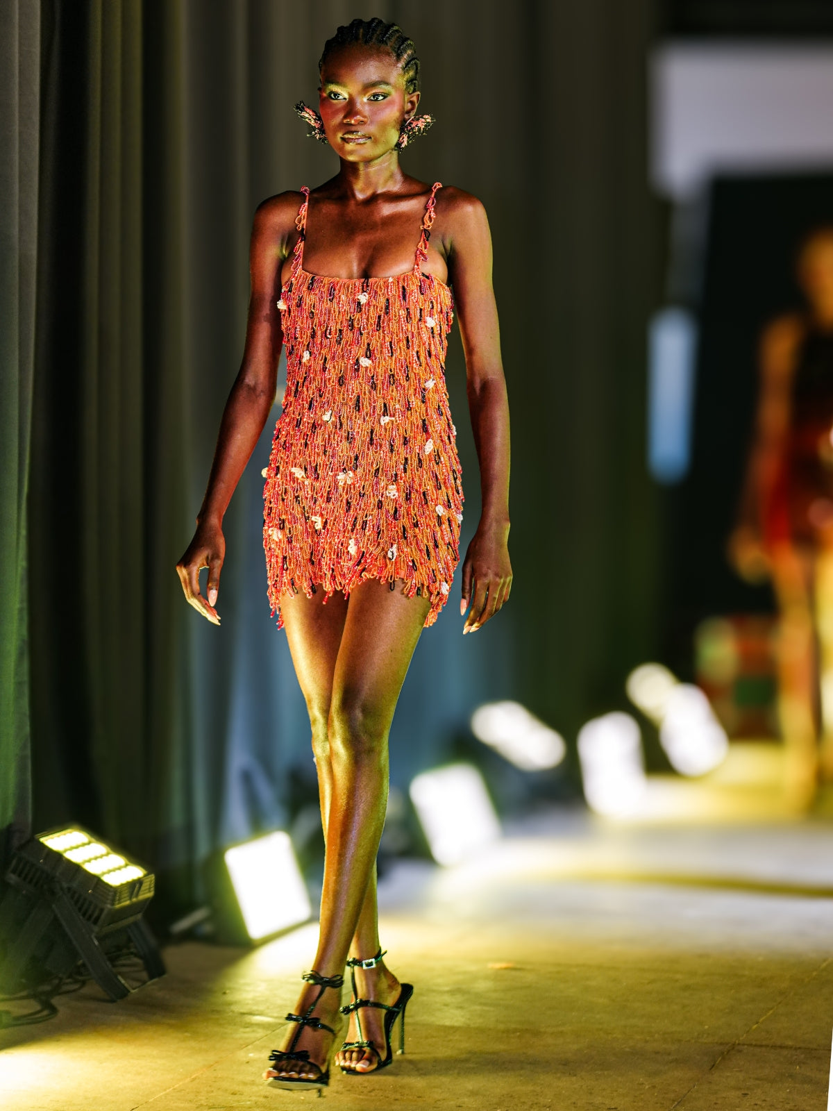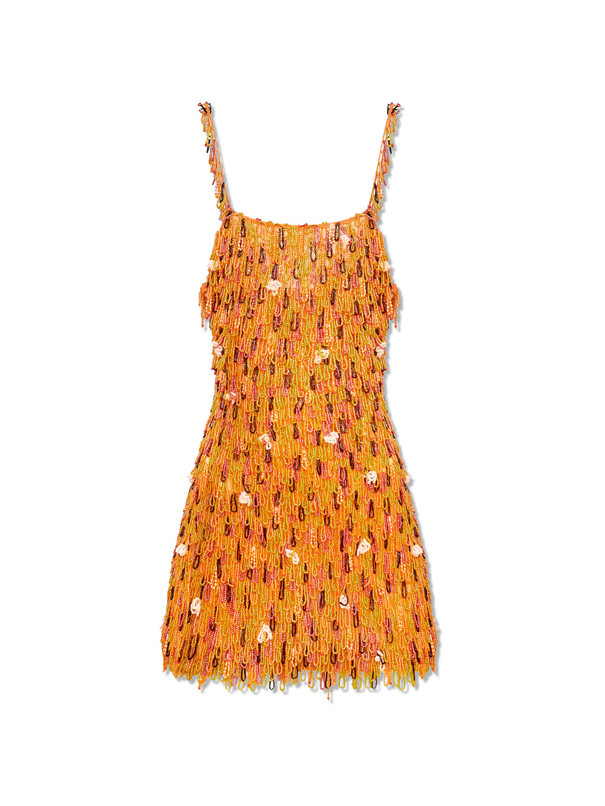 The Zahara Mini Dress in orange feels like a flare of flame against the skin, with mesh, fabric, and beads layering into a radiant, sculptural surface. The short, fitted silhouette keeps the energy bold yet controlled. Pair with strappy heels and the Mini Zaza Bag for a fiery, fully marked statement.